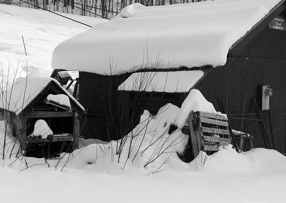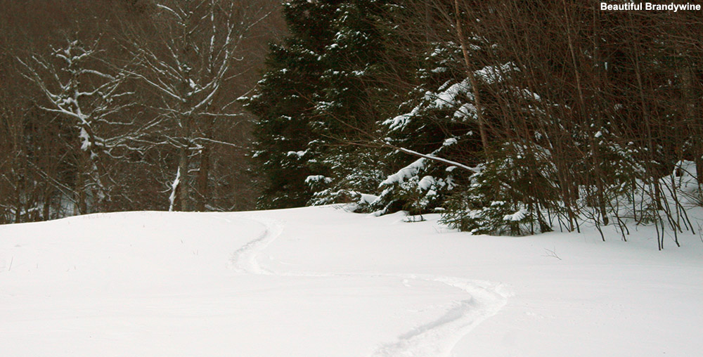 Today I caught up with Shawshank at Stowe sometime between 7:30 and 8:00 A.M. and we hit the usual stashes with other folks that we knew.  The big event came in the afternoon with a 1:00 P.M. meeting at the top of the Gondi and a hike into the swirling mists of The Chin.  Let’s just say, without the guidance of Shawshank, there would have been no way to find anything up there in the near zero visibility.  The wind was probably gusting to 40 mph at times, but it wasn’t bad for the top of a mountain, and by the time we reached the Hourglass Chute, we were protected altogether.  Hourglass was fun, although it seemed to be over so quickly.  I remember reaching this one point about as wide as the length of my skis (the narrow part of the hourglass) and four turns later we had to bang a left to make the connection to Hell Brook.  We traversed for about 50 feet, took a quick step up a short incline, then dropped a nice little section into the low point between the Adam’s Apple And The Chin (so I was told; still socked in).  After a bit more of a traverse, we found ourselves at the top of Hell Brook.  I thought that it was going to be a singletrack adventure down into the Notch; I was definitely wrong there.  As it turns out (at least at this time of year) it is much like an interconnected patchwork of trails, snowfields, and gullies which gradually narrows into a single gully towards the end.  Actually, a lot of it reminded me of the gullies at Alta or Snowbird, except that it was a lot longer and there were hardwoods about.  One could take this thing 20 times and still not know the whole maze; it makes for some very fun exploration.  A word of caution:  there were numerous spots where a wrong turn would mean a big drop or other hazards that could ruin your run so take it easy.  Shawshank lost his goggles in a little open water spot and before anyone knew what was up, they were down the brook and under the snow.  Damn.  We finally wound up on Route 108 for a mostly (one bit of uphill) downhill traverse back to the Gondola and nearly 3000′ of vertical in one run.  By the time we got back to the quad it was about 3:30 P.M. and we were kaput.