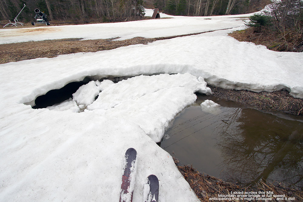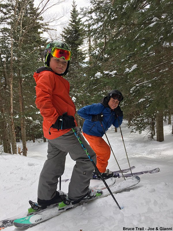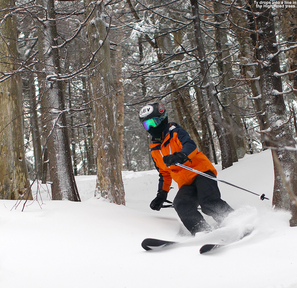 Today, the Sugarbush ski patrol continued applying the same liberal policy that we experienced yesterday with regard to opening trails; if they felt there was enough natural snow to ski them, they just opened them, and today they added Birdland to the mix. We got some of the first “legal” tracks there, which were actually far from the first ones put down on the trail, but they were still quite enjoyable. We followed right behind the ski patroller opening up Birdland as he worked his way down while closing off the side trails; it was certainly fun, and all legal-like. Ski patrol also opened up the North Lynx lift line (bottom 3/4) but it will need some time to bump up for those interested in skiing the great mogul lines that can develop there. Despite today being the canned-food day promotion, crowds weren’t bad at all, since the mountain just kept opening more and more terrain basically as fast as they could get the patrollers to stamp the water bars, close off side trails, and check the padding around the poles (so it seemed). My trail pick of the day, and in fact the whole weekend, would have to be Birch Run off of North Lynx; there was natural snow plus some real nice manmade, and lots of fun terrain without big crowds. All the other members of our Sunday ski posse (Tom “Mango Madness” Bursey, Chris, and E) gave it high ratings. I’m glad North Lynx has had a bit of a revival in the past few years, because there’s some real fun terrain over there. Similar to yesterday, the powder continued to be a bit on the denser side, but that also meant that there was plenty of substance for keeping one afloat. Snowfall continued to fall like Saturday, and it essentially seemed to snow all weekend on and off with a few inches each day.