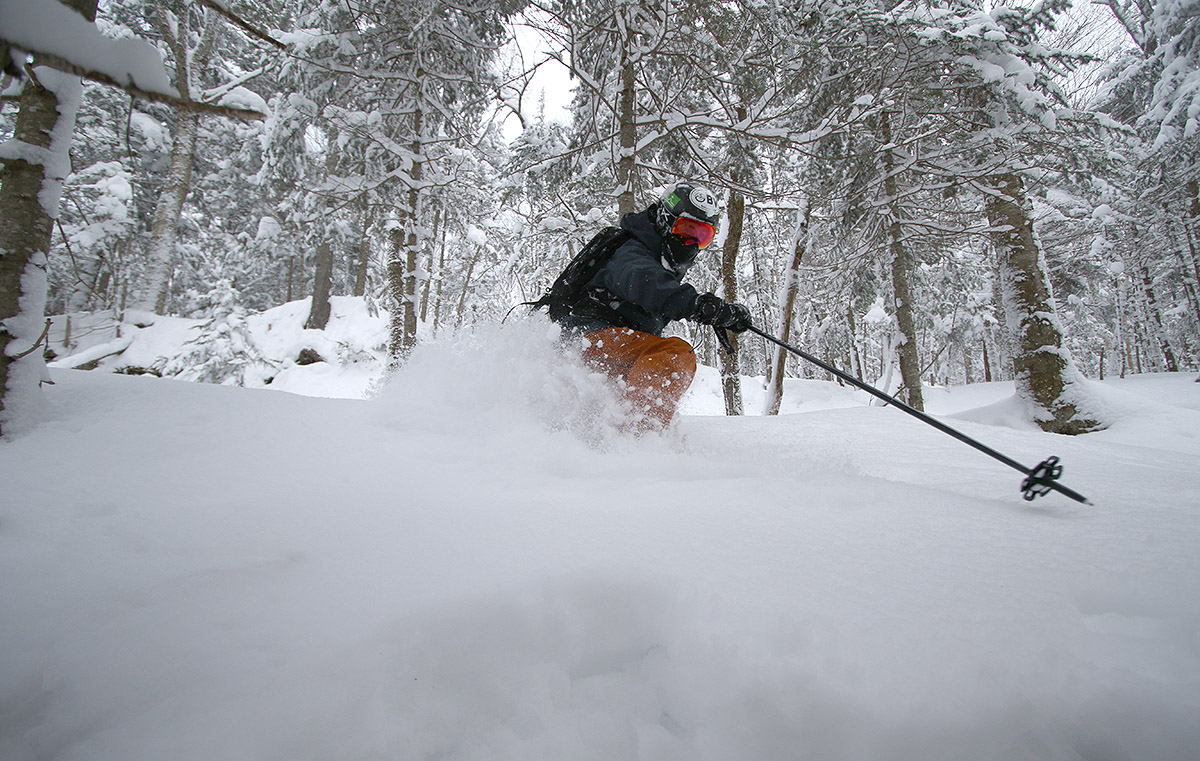 After another run on the tram, we headed over to the triple, and headed for Timbuktu (one of our favorites). We hung to the right to catch fresh snow, but found plenty of ice storm damage in that area, and with the snow that had fallen so far, only very short lines were available, and even then it wasn’t a secure feeling with the fallen trees around. As we headed back left, we found that clearing had been much better, but this area was already getting pretty tracked.