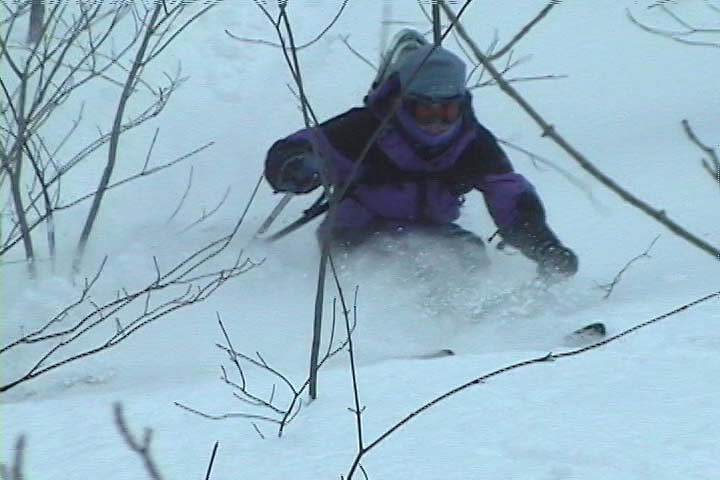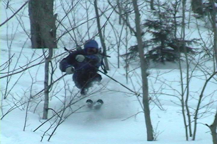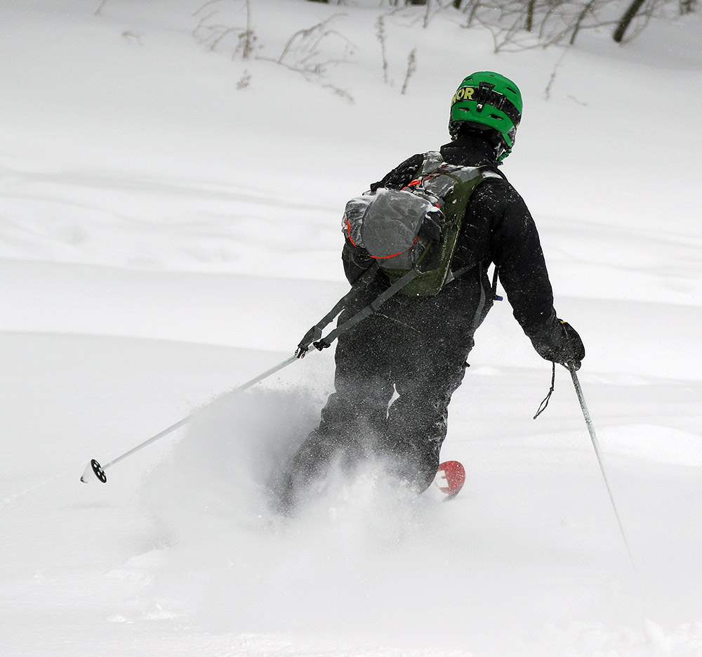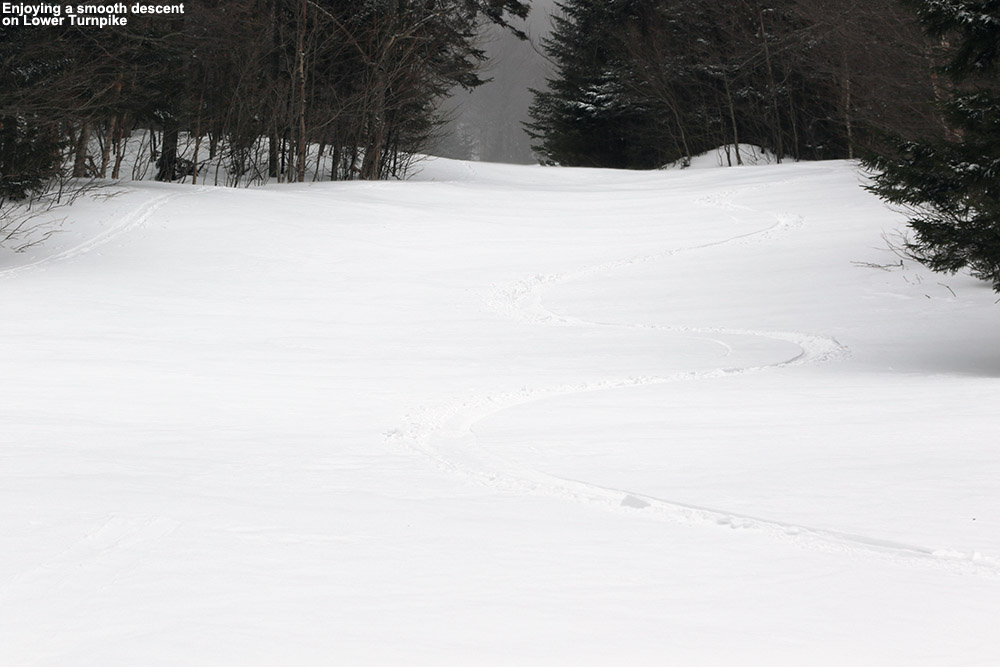 It’s amazing to think that last weekend had been a situation of rain, warm temperatures, and a refreeze that turned the entire snowpack into a solid, crusty mess. From where we were standing, it was basically bottomless powder, a situation in which removal of snowshoes or skis meant trouble standing. The pitch of our descent started off mellow, with various areas of hardwood glades and some underbrush at times. The snow was nice and light; I’d estimate its density at somewhere in the 5-7% H2O range. The slope gradually got steeper as we picked lines along the way that looked good and headed in the general direction of our lower shuttle vehicle. Our general descent route is marked by the thick white line on the map. Even with the deep snow, some areas had enough underbrush that they made picking lines difficult. Some areas we quite clear, but a bit of scouting was needed to find them. James picked direction with his usual finesse, and guided us right down to the parking area and our waiting vehicle (Dave’s pickup truck).