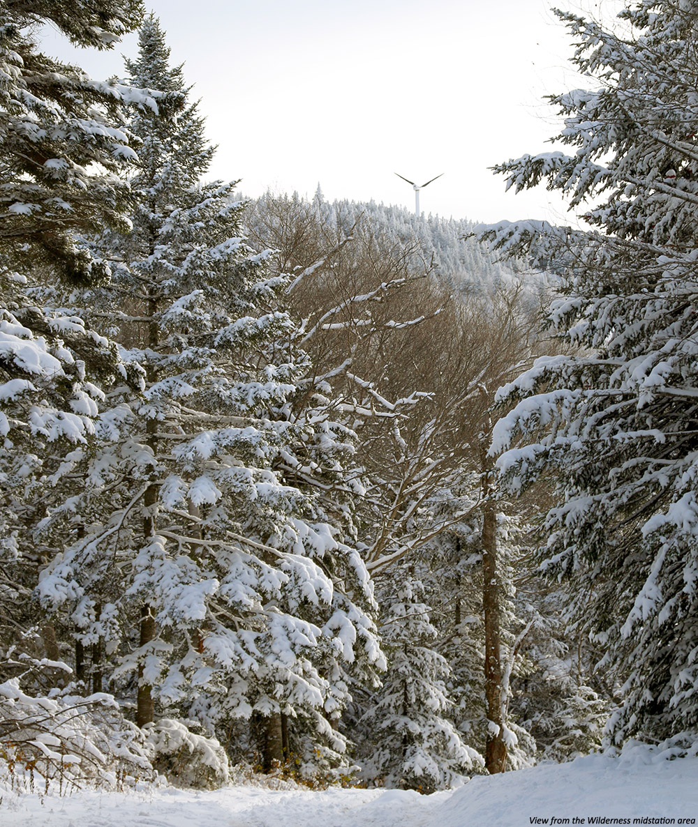 We decided to drive the car along Route 242 to the northeast (in the direction of the Jay Peak base area) as the road descended toward the resort, while we looked for potential ski lines. There were plenty of lines off to our right, as well as a second parking area for cars (yellow dot on the map) at the next low point of Route 242 (elevation ~1,950′). This setup seemed almost too perfect. I say “almost”, because unfortunately The Long Trail doesn’t go in that direction at all, and we assumed we’d have to blaze our own path through deep powder to get to where we wanted to go. We had seen what appeared to be a trail heading off in the direction we wanted, very wide (10 feet or so on average), but we were still unsure if it would work for us. As we got closer, we could see that someone already had a skin track heading that way; we’d found our hiking route.