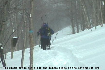 From the top of Route 242, we got our gear together, threw on our snowshoes, and headed out along the trail (our ascent route is roughly marked by the thick blue line on the map). The image of the group heading out shows the general look of the terrain at the start of the trail. I soon noticed from the blazes that this was The Catamount Trail (the HUGE cross-country ski trail that travels the whole length of the state). The upward slope of the trail was very slight, but as we continued on our ascent, Route 242 quickly fell away to our left and we could watch the vertical drop for our potential ski run grow rapidly. At an elevation of around 2,400′, we broke uphill of The Catamount Trail (following the switchbacks of another skin track) to gain some additional vertical. It turned out that other folks had been in the area today, as shown by the skin tracks, ski tracks, and the people themselves. We continued to hike up to around the 2,600′ mark, and then as the slope started to mellow out, we decided to boot up and test out the terrain. A group of about five Telemark skiers passed by on their way up, one of them deciding to cash in at that point and start his descent as well.