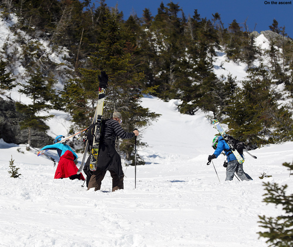 Using our vehicles, we shuttled our crew up to the top of the pass, and started for another run from the upper parking area. Unlike the lower parking area, there were only a few cars there, and no people. The wind was blowing and the temperature had stayed around 10 degrees the whole day, but the sun had come out for a while during our first trek, and it had made that a great hike. We had a snack in the car, and headed off along The Catamount Trail for round two. Our first run had tuned us into the lay of the land its terrain nuances even better, and now James had plans for some even sweeter lines. We hiked the same general route (much easier at this point with the presences of our tracks and those of numerous others who had been up). We cut upward off The Catamount Trail a bit earlier, and topped off near the same elevation as before. This time we found some lines that were even more open, although we did still had to pass through some brushy sections.