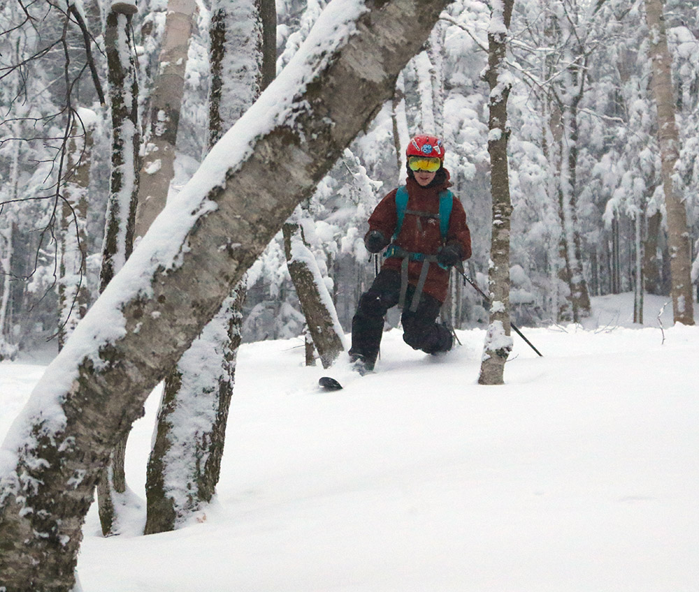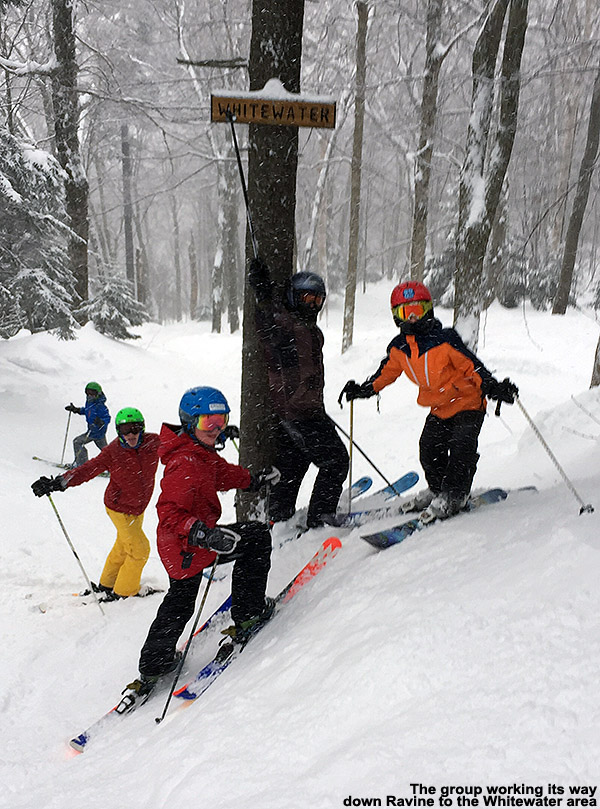 So, with a level of uncertainty still remaining, the family shuffled past the “Experts Only” sign and ventured into the unknown of the “Glades” trail. What we found was far better than I could have imagined. There was no minefield rocks and roots, just a steep powdery playground full of terrain features. After the first pitch, the extent of the coverage and new snow was obvious. You really had to seek out rocks or other underlying debris if you were actually going to hit something with your skis. You could actually ski the trail without concern, and you didn’t need “rock skis” at all. I was flabbergasted that natural coverage could be this good down at this low an elevation. Obviously the ski patrol knew how good the conditions were. Any concern we had for Ty dissolved away as he charged down through the powder on the first steep pitch. The conditions were just too fluffy to care about anything.