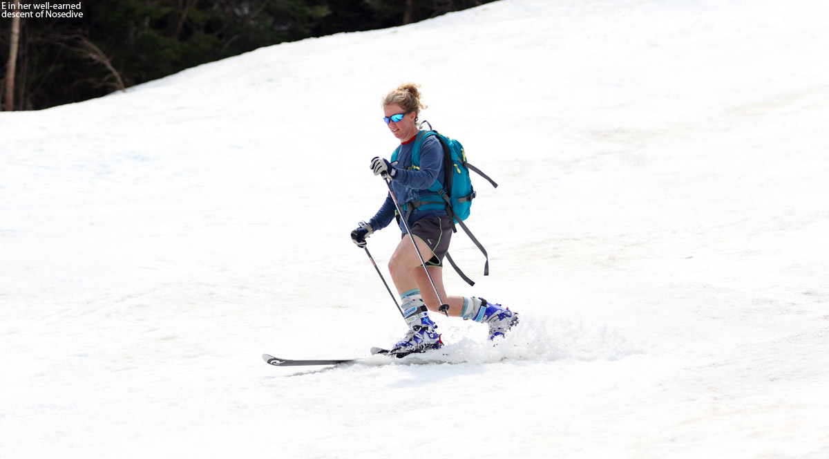 I spied an especially deep untouched line on the skier’s right of the trail, that required ducking under some thin branches, and decided to go for it with Dylan. However, I overestimated the height of the branches and how low I would have to bend. Dylan ended up having to go through the branches with me. I felt really bad about what I’d gotten us into, but once it was too late and I realized where we were heading, I kept him as low as possible without causing us to crash (which would have probably been a worse result because Dylan would have gotten all snowy and mad). In the end, we did wind up tumbling over into the powder, but we were well clear of the branches and Dylan was none the worse for wear. E, who agreed to take a picture of us skiing the line, said that she never thought I would take the line I did. To her, it looked like I used Dylan as a battering ram for the tree branches. That was totally not the case of course. In any event, Dylan is almost two years old now and should probably get used to toppling into the powder like his brother.