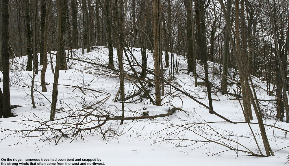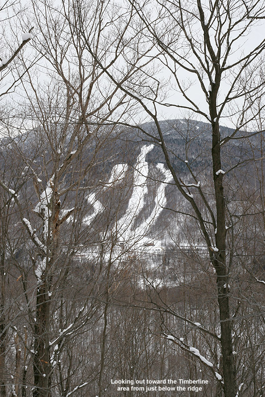 After several minutes of additional climbing, I finally hit the ridge. While the powder just below the ridge had built up to a depth of around 15 inches, on the ridge itself, the snow was heavily compacted and drifted. In some places, the snow had been scoured down to just a few inches in depth. Small trees all across the ridgeline had been bent over and snapped by the strong prevailing winds that raked the area. To the west below me was Bolton Notch, and I could see what looked like some skiable lines dropping eastward toward the Bolton Notch Road. I actually thought I heard the voices of a couple of people below me in the notch, but it was very faint and I couldn’t get a fix on their location. I hiked around the summit ridge for a bit while I had a snack and a drink, then removed my skins and started down.