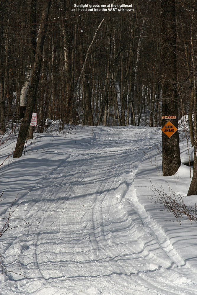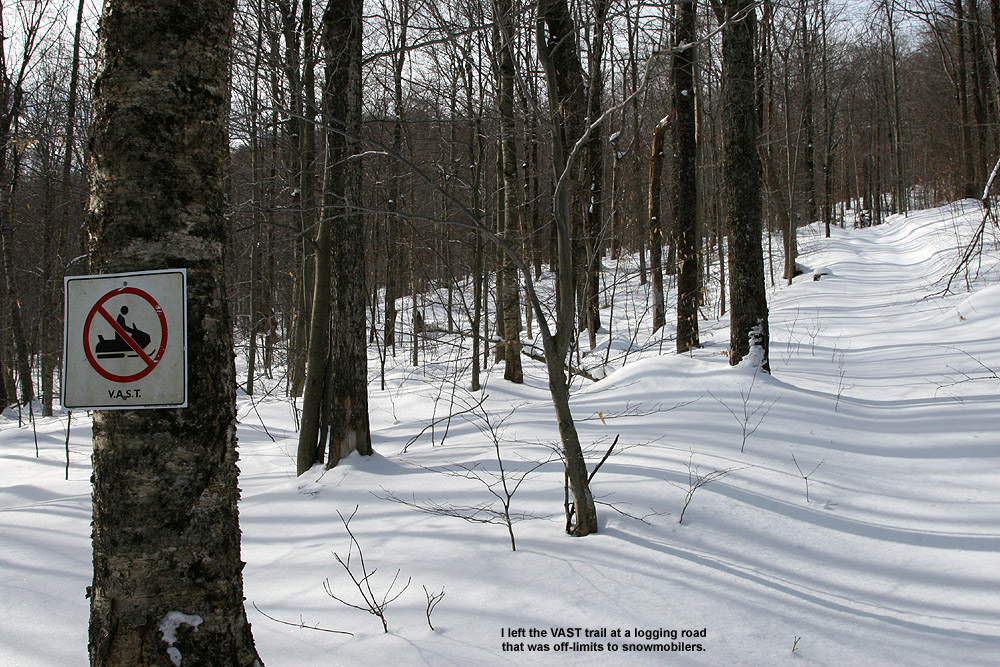 I arrived at the trailhead in late morning to sunny skies and a temperature of 19 degrees F. There was only one snowmobile trailer in the lot at that time, so the lot looked pretty deserted. I started skinning westward on the nicely maintained VAST trail, which at first had a fairly gradual slope. Then, I crossed a large bridge, and the trail steepened. After maybe 50-100 vertical feet, the trail flattened out and turned to the south. At that point I decided to break away from the VAST trail and head westward up the ridge. The going would be slower once I had to get off the trail and break my own way through the powder, but as far as I could tell without a VAST map, the VAST trail headed more southward and was not going to get me up the ridge where I wanted to be. I finally broke off the VAST trail at the intersection with an old logging road. There was a sign indicating that the logging road was not open for VAST travel.