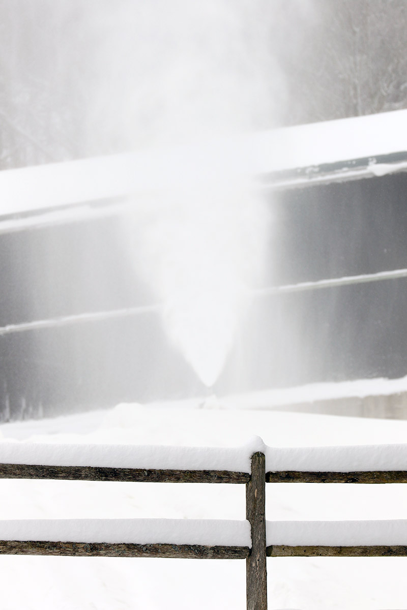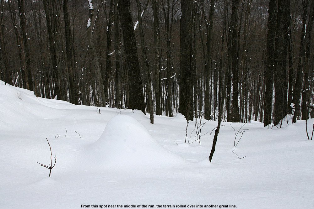 To ensure that I’d be able to get right back to the car without having to do any hiking along the access road, I followed a downhill route in the same general area as my skin track. Sometimes I traversed out above my skin track and skied back down to it, but for much of the run I was able to stay off to the skier’s left of my skin track and follow the natural contour of the terrain. Even with the snowpack below average (as gauged by the snow depth at the stake on Mt. Mansfield being at only ~54 inches), one could pretty much ski anywhere in the area I explored. There were always some lines that seemed to be the pick of the crop, but there were few areas where the vegetation was too thick for turns. There was plenty of powder for bottomless turns throughout the descent, and the depth of the base let me tackle the lines with a fair degree of confidence. With the potential for 3 to 4 feet of snow from the storm this coming Wednesday, I suspect there will be even more wide open lines. A storm of the size expected would likely bring the snow depth at the Mt. Mansfield stake close to 80 inches, which would actually be above average for this time of year.