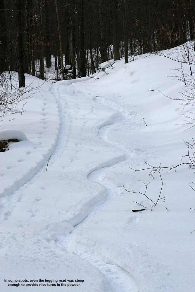 Despite breaking my own trail, the going was pretty smooth. I’d checked the depth of the powder just after I started my hike, and found it to be 9 inches over whatever thicker layer was below it. At the bottom of the logging road, the snow was still in the 9-12-inch range, so I wasn’t bogged down by too much depth. I continued upward, following a network of logging roads and taking the route that seemed to best direct me toward my destination on the ridge. I spied plenty of great ski lines along the way, and I marked a few of the more attractive ones on my GPS. The logging road seemed to have been maintained and it made for quick travel; at least it appeared that way with the snowpack at the time. If there was a forest of saplings growing on the road, they were long buried under the snowpack. There was only one obstacle that forced me to detour from the logging roads, a huge tree that lay across the trail near the middle of the hike. It took a few extra minutes to work my way around that one. Currently, with the additional 3 to 4 feet of new snow from Wednesday’s storm, that tree is probably not even an issue.