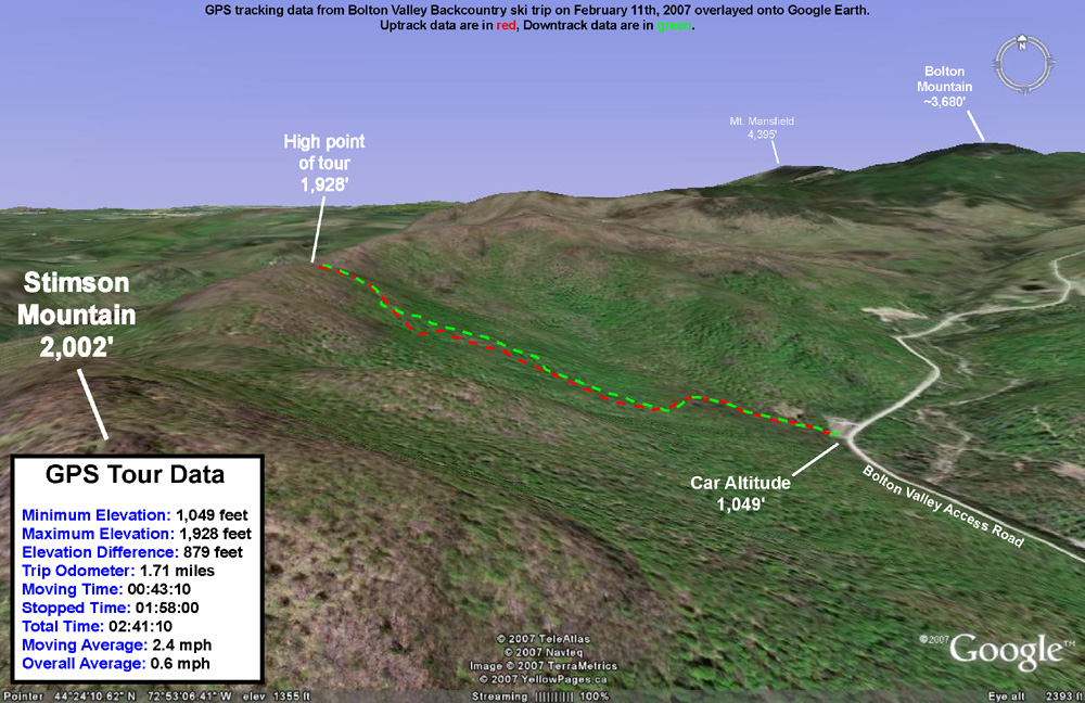 Today I headed out for some backcountry exploration in the Bolton area. I was sure that James would still be resting his ankle, so once again I made it a solo outing. After exploring part of the Cotton Brook drainage the previous week, I decided to switch it up and check out something on the other side of the valley. A convenient starting area for reaching the terrain on the western side of the valley is one of the VAST (Vermont Association of Snow Travelers) access points. The ample parking lot sits at an elevation of roughly 1,000 feet on the Bolton Valley Access Road. My plan was to start out on the VAST trail that heads west from the parking area, and make my way up to the ridge line that extends north from Stimson Mountain. The summit of Stimson Mountain is at 2,002 feet, and the ridge maintains roughly that elevation for several miles as it heads northward toward the Bolton Mountain area. If I was able to find a suitable route to the ridge, and the terrain was appropriate, the tour would provide about 1,000 vertical feet of skiing.