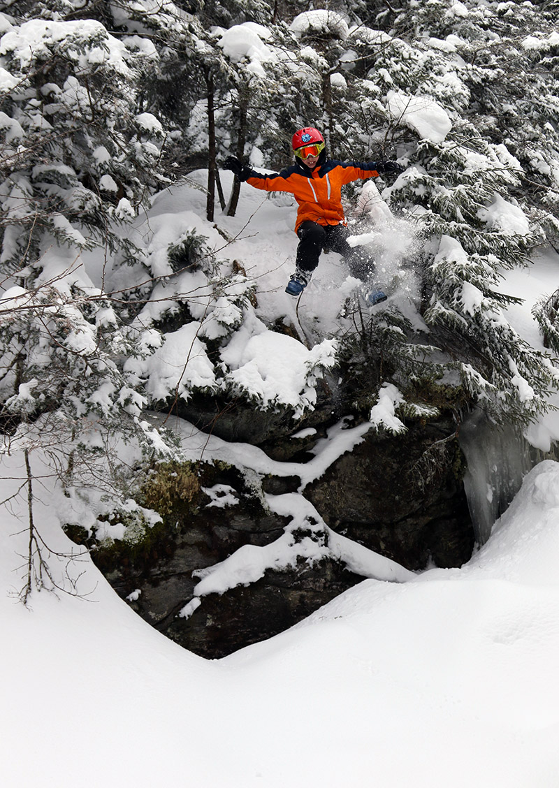Ty and I headed up to the mountain today to cash in on the new snow. We arrived in the Bolton Valley village (2,100’) to a temperature of 5 F, but it eventually warmed up to around 20 F, the sun came out, and we were rewarded with an awesome powder day. A great part of the day was having lunch in the James Moore Tavern while we watched people ski the powder in the terrain park. An even better part of the day was finishing up lunch and then hitting those powder lines ourselves! Ty got to ski a lot of untracked snow today and I could see that his powder technique continues to improve. Check out all the pictures and details in the full report from today.