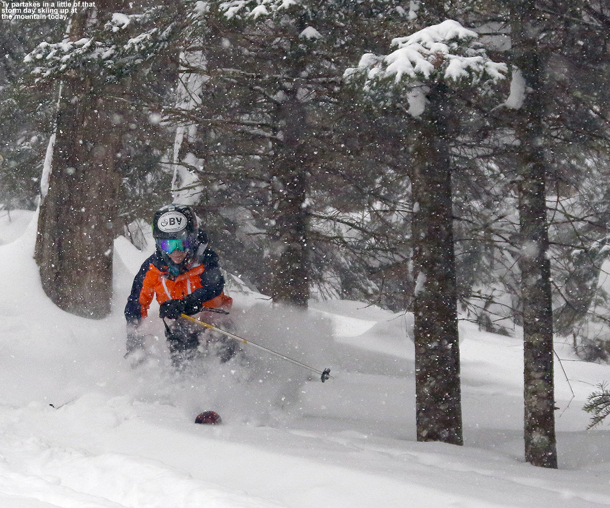 This morning we woke up to find that 4.9 inches of 2-3% H2O Champlain Powder™ had fallen at the house overnight.  I’d expected the more typical inch or so that we’d been receiving with the impulses of moisture that were supported by the upslope flow, but conditions for snow growth had clearly improved and we were happy with the surprise.  The Bolton-Stowe area was reporting 6-7 inches of new snow, so Ty and I headed up to Bolton to catch some of the morning freshies.  It seemed like the skiing was going to be great with another half foot on to of the 10 inches of dense snow they’d picked up in the previous couple of days.