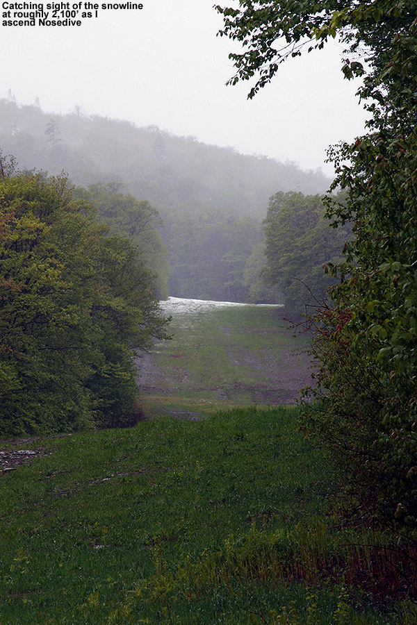 Below I’ve added a web cam image of the east side of Mt. Washington from last weekend, showing the various areas of snow that were present at the time. The longest runs up near the summit still seemed to be off the main east snowfield that we didn’t visit. We haven’t had any of the hot temperatures that we had the week before our visit, and things have been much more seasonable, so there should still be some decent easy access skiing up there at this point.