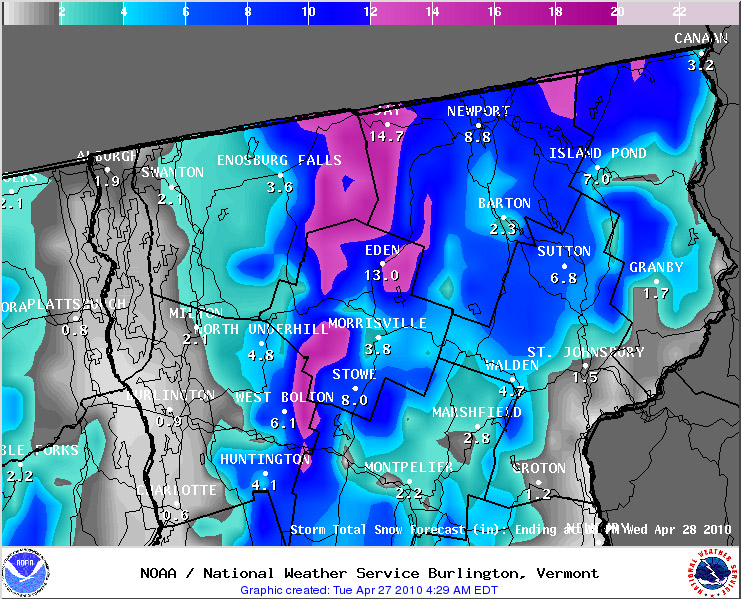 Our first big Northern Vermont storm of the season came in with a nice thump of snow during the overnight hours, and I awoke to find 7.1 inches of moderately dense snow on the snowboard for my 6:00 A.M. report to CoCoRaHS. Later in the morning the National Weather Service Office in Burlington put out a map showing the overnight snow totals, but the snow was still coming down. Snow continued to fall at the house all morning, and while it gradually tapered to very light snow, we picked up a few more inches to bring us into double digits for the storm total.