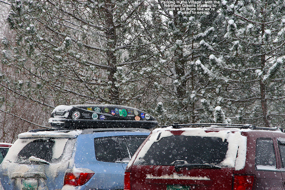 Today started off great when E woke me up and said that it was snowing, and that we’d already picked up an inch of new snow. Last I’d heard, the overnight forecast was for partly cloudy, so the snow was quite a surprise. I measured 1.1 inches of snow on the snowboard at 7:00 A.M., sent in my observations to CoCoRaHS and posted them on American Weather, and then E and I were off to Stowe for school ski program training day. There was some snow on the way to the mountain, but once we got there we found consistent light snowfall, and it turned out that that’s what we’d encounter all day. E had arrived early as one of the program coordinators, so the scene in the Spruce Peak Village was incredibly quiet for a Saturday morning. It wasn’t long though before people began to arrive and the old Day Lodge building where we were set up was bustling.