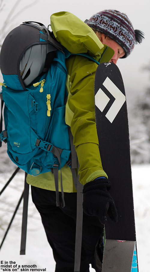 We met up with Mike and headed over to the Gondola, finding that it was feeling especially wintery when we got up to the Gondola summit around 3,600’ or so. There was a bit of snow falling, some wind, and tons of snow on the ground; it was definitely a midwinter scene. Mike suggested that we hit the switchbacks along Gondolier, and as we headed down that way, I cut uphill from Upper Perry Merril to check out some of the snow on Upper Switchback – there was over a foot of powder up there over plenty of base, and if I hadn’t been coaching I suspect some off piste exploration would have yielded some really nice turns. The main issue keeping all off piste terrain from being accessible is just that snowpack is still somewhat low, so getting into the trees (especially steep stuff) isn’t quite there for all locations yet. With that said, Mike noted that yesterday he was out exploring the Goatdive woods and environs (on his super fatties and being very cautious) and had a good time. I’m not recommending this of course, since he’s very familiar with all those lines from hiking them in the off season, but things are certainly getting close for that type of terrain. The 26 inches of snowpack at the Mt. Mansfield Stake isn’t just 26 inches of fluff, there’s plenty of substance in there, and as Powderfreak and I talked about over in the American Weather Forum, that’s the snowpack depth where appropriate moderate-angle tree skiing gets going around here. We certainly weren’t planning to explore much off piste with the kids today anyway, but it was nice to find that there are some fantastic powder turns out there already. As we continued down below the upper mountain, we found that the lower sections of Switchback were OK, but for whatever reason they seem to be really icy in spots as I’ve often seen. One would think they’d get less traffic than Gondolier or Perry Merril, but something turns the snow bad in there – perhaps it’s the narrowness of the trail constraining traffic in a small area.