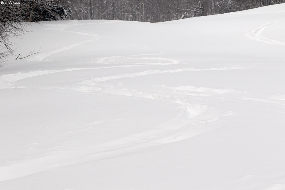 We set out toward Lower Smuggler’s, hoping to find some “satisfying” turns like we found yesterday at Bolton. Lower Smuggler’s didn’t turn out to be that impressive; there was a lot of manmade snow on it that was rather firm, and not a lot of extra untracked snow off to the sides. With all the racing going below on Slalom Hill, we took the alpine slide tunnel and headed toward the meadows area to see how the natural snow in the upper meadows was skiing. We cut around the very top of the area in case it was crusty of coverage was poor, but once we cut back in we found that it didn’t matter – the snow was quite decent. Even though that area is south facing and very low elevation, there were a couple of inches of substantial powder over the base snow. The base was a little variable due to what seemed like wind and some previous melting, but the quality of the turns was impressive. At one point I believe I commented, “That wasn’t half bad… that wasn’t even a third bad!” There are still a few blades of tall grass sticking out here and there, but that’s really decent coverage for such a location with snowfall being substantially below average.