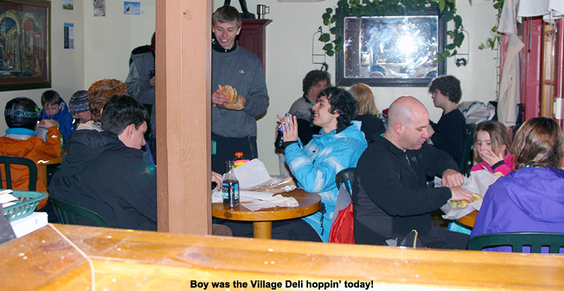 I called to check in with Stephen, and he was just coming down from a run, so we were able to meet up before I left. His knee was bothering him, so he was heading into the lodge, while Thomas and Helena kept going on their own. With the temperatures warming and the snow becoming stickier by the minute, I was definitely happy to head home to save up some energy for tomorrow’s skiing at Stowe. There’s the chance for some additional snow tomorrow, so that’s great news for the slopes. And, knowing Mt. Mansfield, it may not have warmed up there quite as much as it did at Bolton today, so the quality of the skiing could be even higher. The really impressive spring-like temperatures were in the valley today though; when I got home, it was sunny, with temperatures in the 40s F, and Kenny and the boys were having a blast with snowballs in the yard. Spring is definitely starting to make inroads in the valley.