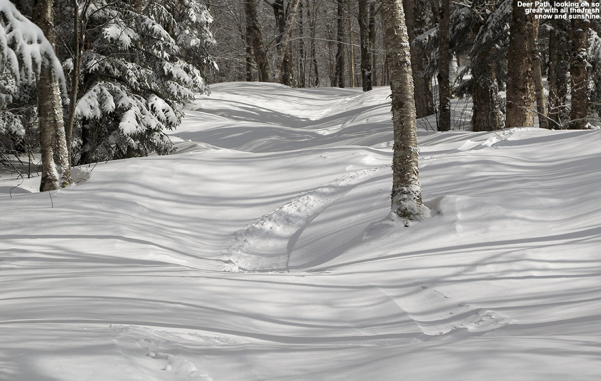 We still descended at that point, and went by the same route we climbed, knowing that the coverage was decent and there would be a lot of good turns. The boys had several days of fairly intense Telemark training toward the end of the lift-served ski season at Stowe, but it’s been a few weeks since they did all that work, and E was wondering if they would retain all the progress they’d made. It was also the first time since those sessions that they’d been in powder, chowder, or any type of winter snow. We were happy to see that those first turns that Dylan made weren’t a fluke, and the boys really made a lot of excellent Telemark turns, even some in steep terrain in the chopped up powder. Various groups of skiers and riders had used the North Slope route by this afternoon, so most of the terrain was tracked up, but we still found some nice areas of untracked snow, and those were some of the best turns of the day. The last pitch of North Slope had a few tricky spots because it’s steep and has some areas of rock instead of grass, and then below Crossover in the terrain park area it was a game of connecting the dots among sticky snow, but it was a pretty minor part of the run compared to the bulk that had good snow. The fun part about that last section was the team route finding, and playing in the pockets of powder that had settled in among the vestiges of the some of the terrain park features.