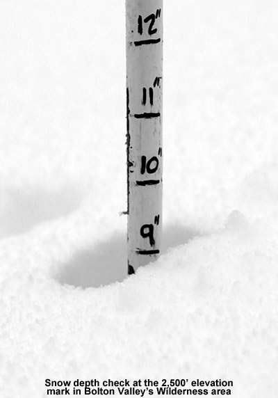 Unlike yesterday, we found the gate to the Mansfield parking lot fully locked, so we parked right near it along with the cars of a few other people who were doing the same thing. We geared up, and walked over to the area above the Mansfield Base Lodge. The morning sun was already warming the snow in the lowest elevations, and I could see that there was less snow down near the lodge than when I’d been there yesterday. The temperature was still 34 F at the base though, so the freezing line wasn’t going to be too far above us.