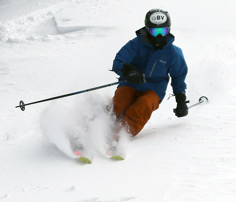 After E had had her fill or turns for a bit, she got behind the camera and I did a few more runs, including a side trip over to that other small snowfield to our north. That one had some pristine snow, and it was a neat perspective getting shots of that snowfield from the side. In general, the consistency of the snow was excellent today everywhere we went, but the main area was more tracked up, so the smooth turns were a treat. Skies were generally blue, turning whiter as the afternoon wore on and clouds started to build in. Having been out on the snowfields in less than optimal conditions before, we appreciate that fact that there was sunshine, minimal wind, no bugs, and simply perfect air temperature. It would have been awesome if the whole snowfield had held together with good coverage for today, since the runs would have been much longer, but even sticking to the upper section of snow was enough for some good turns, and with the way this season went, it’s really nice to even be skiing on Memorial Day Weekend. We actually never even visited that other chunk of the big snowfield that was down below the one we skied, but now that I look back at the web cam images and see what others had to say, it sounds like it was pretty decent in size and was probably offering up some fun turns. Each year though, I get a better ability to translate what we see on the web cam images of the snowfields into what is actually on the ground, so we’ll be able go in with an even better perspective on what we want to ski next time around.