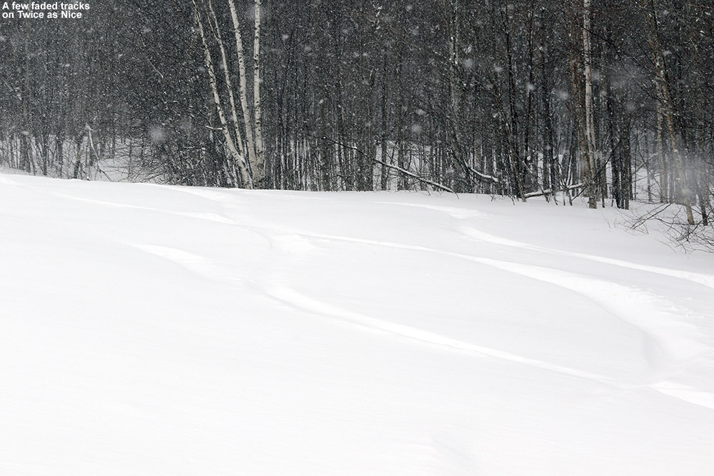 Unlike last year’s trip, when the remaining snow was only toward the bottom of the general East Snowfields area, there is currently substantial snow much higher up, so even in our Telemark boots it was a quick five to ten minute descent today to get down to the skiable snow. We met a couple of guys from Time For Tuckerman Forums who are part of the Memorial Day Slackfest tradition, and had a fun time chatting with them. One was RR, who plays a big part in the gathering and sets up the poles for the slalom that they like to have on Memorial Day. RR and others have been keeping the auto road & snowfields conditions thread nicely updated with pictures, so many thanks go out for their work. They filled us in on the status of the snow while another couple was just hiking back up from a run. We were on the top of the main snowfield section, and it was broken up into three areas, with another similar snowfield down below us, and a smaller one off to the skier’s left. Our snowfield had a choke point in the middle with some exposed rocks, so one had to be careful going through there. It turned out to be enough of a hassle that we spent most of our time skiing the section of the snowfield below that point – the rocks just broke up the flow too much to try to get through there. The turns were nice and smooth below that point though, and even sticking to just that one snowfield seemed to give us more vertical that we’d found on last year’s trip.