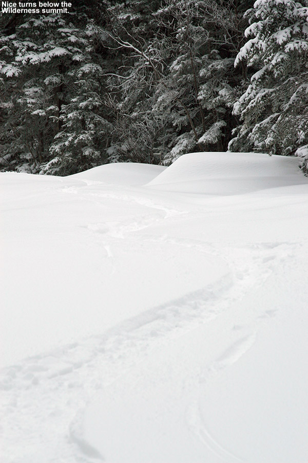 It was fun to get E’s impressions of the trail since this was her first trip down the Bruce. She found, and I entirely agree, that on today’s outing the combination of the relatively narrow nature of the trail, the areas where the formation of moguls tended to dictate specific locations for turns, and the concave sculpting of the snow due to skier traffic, all come together to create quite a challenging ascent on Telemark gear. I noticed those aspects as well, and indeed in this case what is really pretty standard intermediate or advanced fare on alpine equipment, is much more technically demanding on Teles… or at least it is if you’re trying to make Telemark turns. Trying to navigate those concave edges while snaking down a narrow line (and even feeling narrower in a Telemark stance) among moguls on terrain with decent pitch will certainly push your skills. Fortunately one can use alpine turns as a fall back, and those are certainly a lot of fun too, but of course trying to be strict with those Tele turns keeps the bar up. Even with the great spring snow, E favored alpine turns heavily in the steep, upper sections of the trail, but there were plenty of areas where her Telemark turns would flow. I threw in good doses of alpine turns myself in spots, because sometimes it’s just too hard to plot a solution with Tele turns through certain areas. But, every run gets more turns under your belt. Dylan threw in a few Telemark turns here and there, but he already knew going in that he was going to mostly alpine and just enjoy the ride in that fashion.