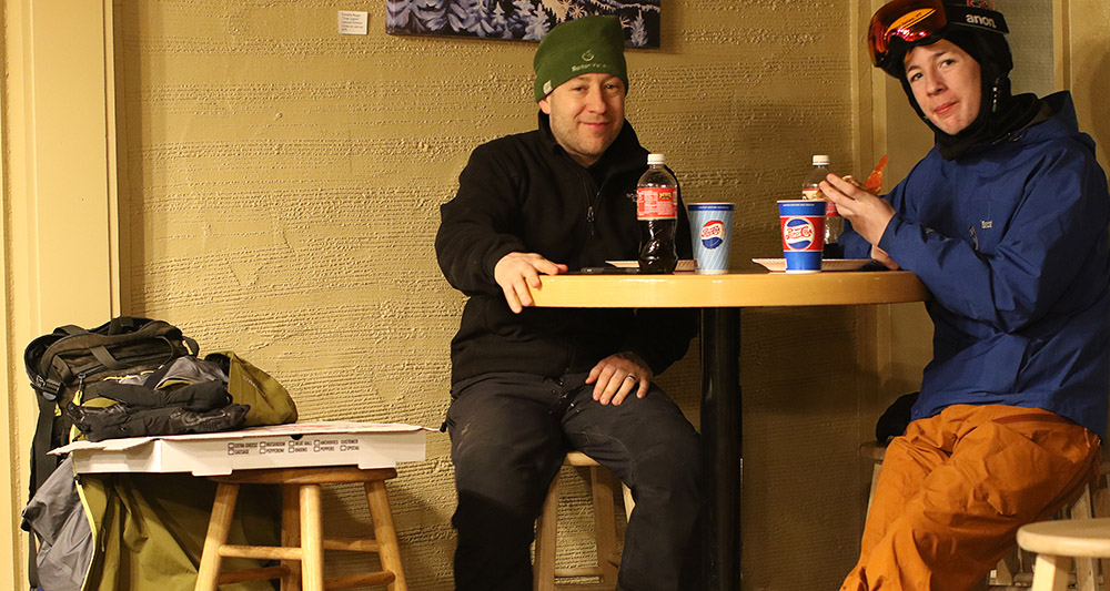 Today we planned to flip our Bruce Trail tour setup from what we’ve done in the past; we’d park the car down at The Matterhorn, ride the Mountain Road Shuttle up to Mt. Mansfield, ski the mountain for a while, and then finish off with a run down the Bruce and a meal at The Matterhorn. We timed things pretty well with knowledge of the Mountain Road Shuttle schedule, and arrived at The Matterhorn in the early afternoon with time to get into our gear and head across the street to the shuttle stop. The plan was for everyone to Telemark since the boys could get in some lift-served practice runs and it’s generally a good fit for a trip down the Bruce, although Ty opted for alpine gear at the last minute because that’s what he felt like skiing.