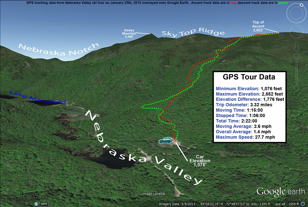 Around mid afternoon we decided to head down the Bruce for our final run, and the snow was nice and soft right from the top. The only notable coverage issues were in the usual spots – those steeper pitches with southern exposure. Those areas had opened up a bit since last week, but the differences in the skiing are fairly marginal; you’ve just got to navigate those areas cautiously. As expected, the lowest elevations in the Nordic areas in the 1,500’ – 1,000’ range had perfect coverage. The only potential break in the snow cover down there is the last hundred yards or so where you use the road the leads to the Bruce House. The road has been plowed, but you can ski on the snow banks along the edge of the road and they’ll take you right out to Route 108 as usual. The whole trip down the Bruce was extremely quiet today – we didn’t see a single soul on the Bruce itself, and we only saw one family touring on the trails of the Stowe Mountain Resort Cross Country Ski Center. Perhaps the holiday kept the numbers of visitors down relative to a typical Sunday, but the resort looked pretty busy overall. I didn’t track today’s travels by GPS, but for a representative GPS/Google Earth map or elevation profile plot of the general route of the Bruce Trail, refer to my Bruce Trail trip report from January 21st.