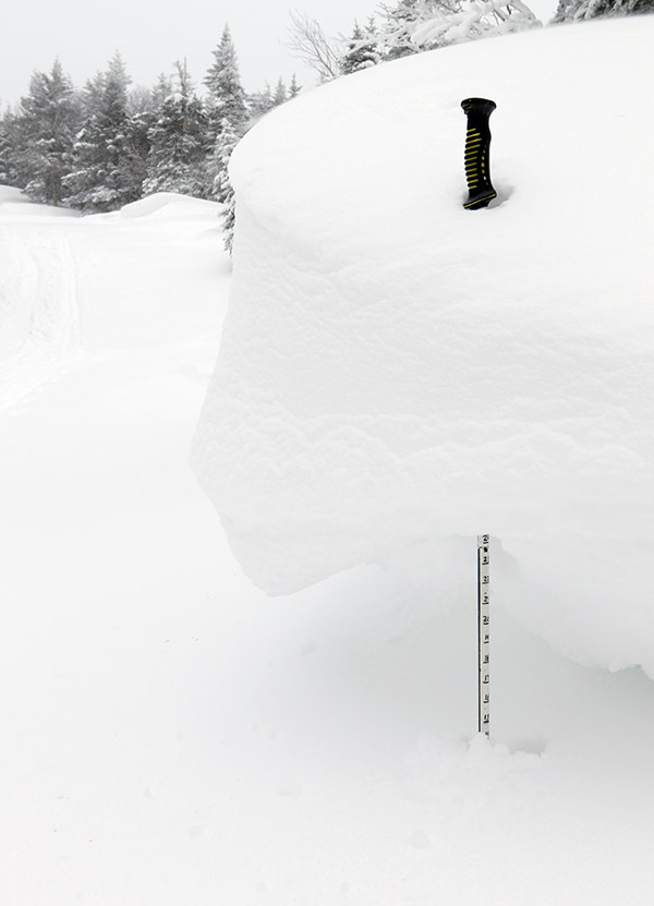 The resort appeared absolutely deserted as I began my ascent behind the main base lodge. The wind was howling at times, and it was certainly pushing the snow around and making it difficult to get a read on just how much had fallen. I took a route up Beech Seal and then Cobrass to the Vista Summit and made the following measurements for new snow over the old spring subsurface: