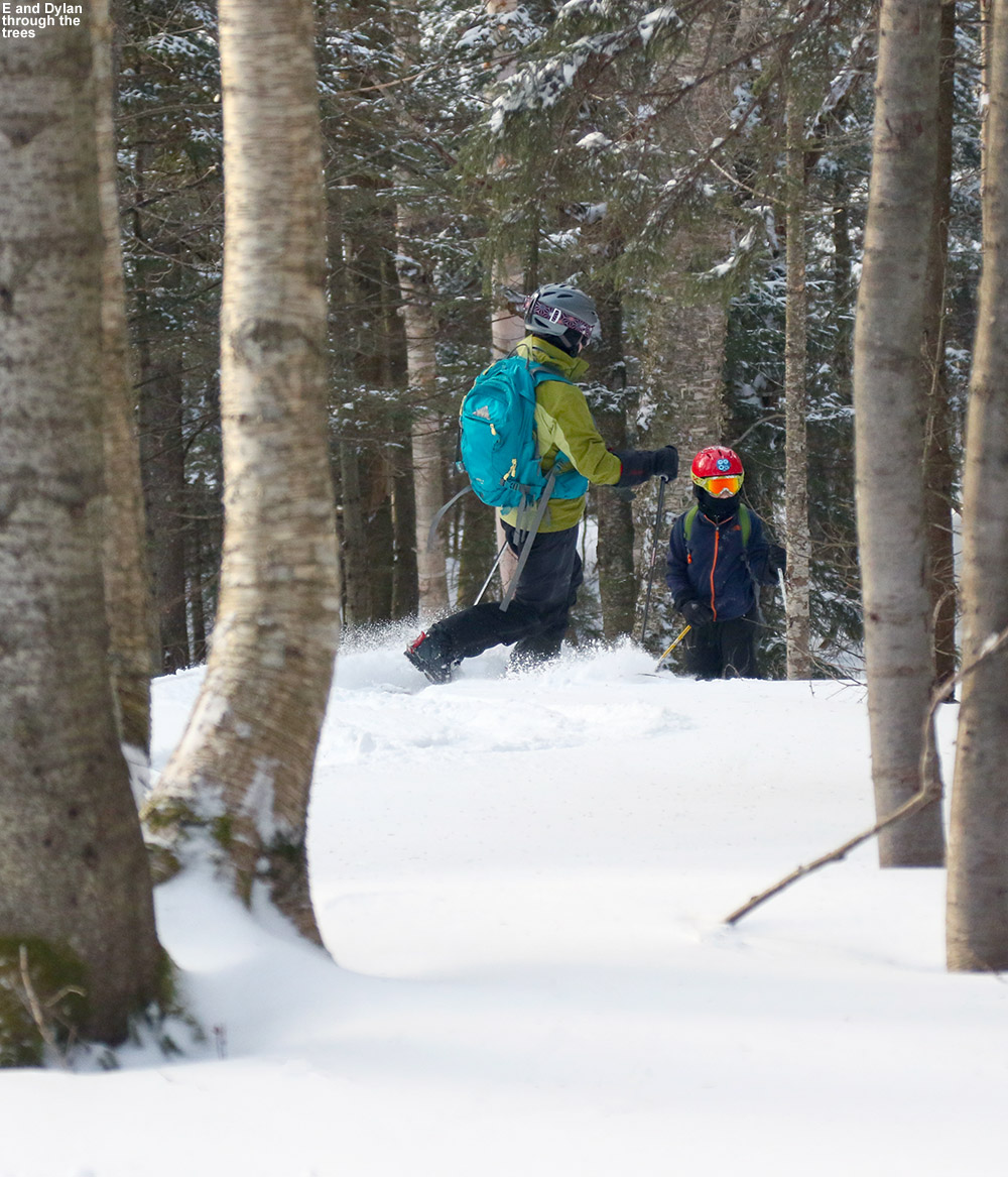 Based on the snow surfaces, I didn’t think there was much sense in heading above tree line, but the ascent over to the top of the Gondola still looked viable, so we set our sights on that. To make it easy on the boys, especially since they’ve been under the weather a bit this past week, I took care of carrying their skis for them. I skinned with my skis, and attached theirs to my pack. We actually encountered a number of people heading over to the Gondola via Rim Rock, they were keeping that aggressive traverse that would let them reach High Road and maximize their vertical. We were heading higher than that though, since we continued up Cliff Trail once we got to that High Road intersection. After a break at that intersection, we continued on up with the Cliff Trail ascent, and even though it’s just an intermediate pitch, it looked daunting to the boys compared to what we’d just traversed. It really went quickly though, it felt like we began to see the top of Cliff Trail just after ascending the first steep pitch, and even with the boys somewhat beleaguered pace due to recent fought illness, it couldn’t have taken much more than 10 minutes. We could still see some sunlit terrain above us at that point, so after a quick break, we continued on a bit more and finally stopped our ascent up near the flats leading to the Cliff House. In terms of both sunshine and slope, there wasn’t much point in going beyond the first big pitch of Perry Merrill. We could hear, and in some cases see, people picking their way down through the Rock Garden and other, even steeper lines off the Mansfield ridgeline, and it sounded horrible up there. That terrain is shaded, high in elevation, and steep. It looked like it was worse than what we’d found on Nosedive, and that experience was already going down as serving up the most hellacious ski conditions we’d encountered all season. At least the snow was being well-preserved for future use, but it had me longing for the fresh snow that Ty and I got to play in last weekend.