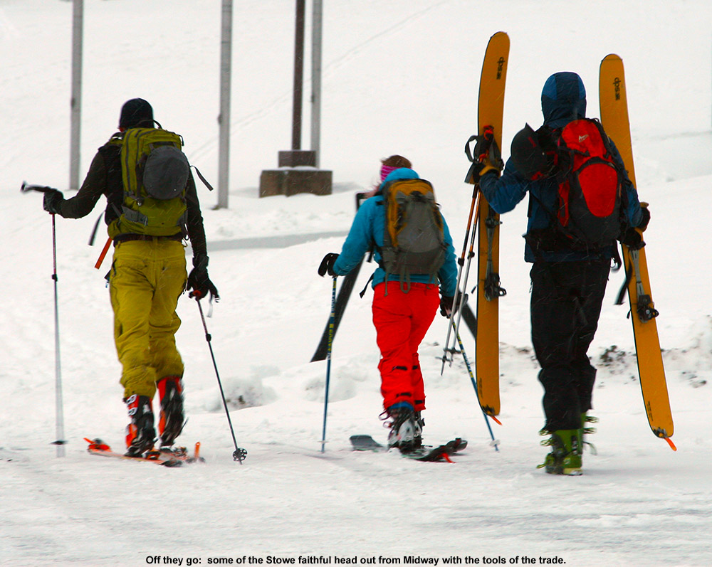 The front came through overnight as expected, dropping about an inch of snow down at our house, and more in the higher elevations. Things seemed to have come together, so I decided to head out to Stowe for an early ski tour. Temperatures were generally in the mid 20s F as I traveled through the mountain valleys, and there were no issues with the roads until I started climbing up toward the mountain around 1,000’. Above that elevation I found enough packed ice and snow that it warranted a bit more cautious driving. At the Midway Parking Lot (1,600’), the temperature was 20 F and there was light snow falling. There was the usual crowd of early morning skiers heading out and returning from the slopes, and I suspected it would be easy to find a nicely established skin track on any of the typical routes.