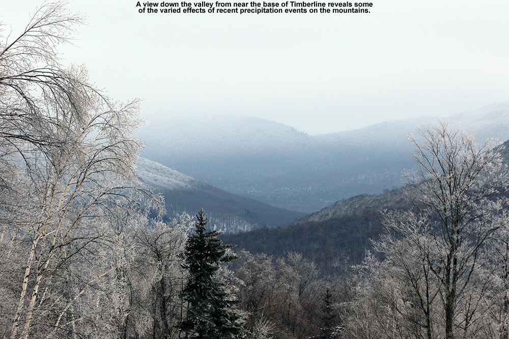 We’re experiencing warmer temperatures right now ahead of the next incoming storm, so it’s been quite comfortable out there. It was around 30 F at the house when I left at noontime, and mid 20s F up on the hill. It was cloudy, but unlike the persistent snowfall of yesterday, there was only the occasional spit of snow in the higher elevations. Like yesterday, I was able to grab a parking spot in the top lot from a car that was leaving, and after getting on my gear I headed right over to catch a ride on Snowflake. While on the lift I was able to watch a snowcat working on the Butterscotch Terrain Park – all the snow piles were being flattened, and they play to open it tomorrow for skiing without features. Only Timberline Lane and Lower Villager are open on the skier’s left of Snowflake, so I opted for Sprig O’ Pine to get me down to the Vista Quad. The snow on Sprig O’ Pine was nice, not as soft as natural snow of course, but good because traffic has been minimal there. I took the alternate loop out toward Deer Run, which did have natural snow – that was really soft, and as it’s a protected area there were some beautiful accumulations of snow on the trees.