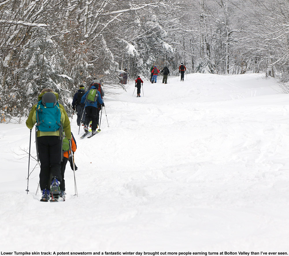 With the prevailing temperatures, I wasn’t all that excited about riding ski lifts myself, but since the snow depth at the Mt. Mansfield Stake came in at 36 inches yesterday, that got me thinking about a backcountry tour on the Bolton Valley Nordic and Backcountry Network. With three feet at the stake, much of the terrain on the network should finally be in play, and I was eager to see how things were going up there with $40,000 having been invested since the state took over a large portion of the land in June.