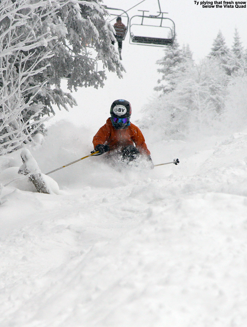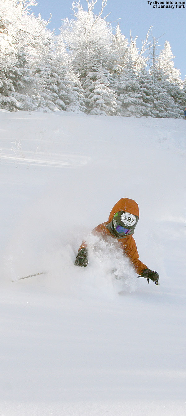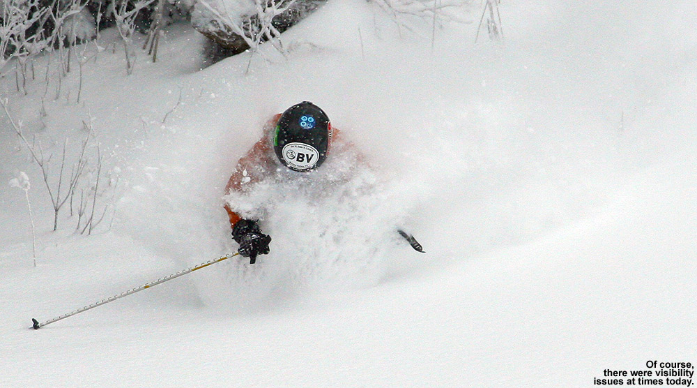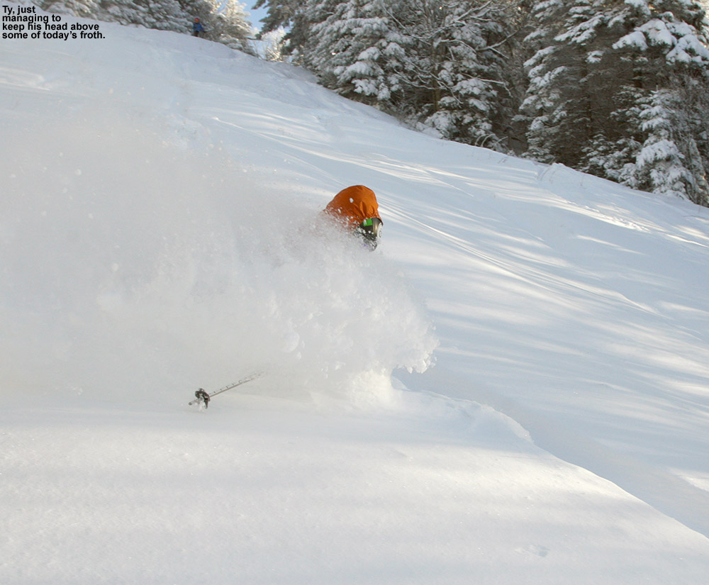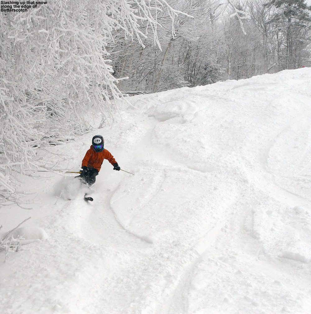 Although I saw some good potential in some of the glades, I stuck with my plan to run North Slope all the way out to Lower Turnpike and ski down there, because after yesterday’s experience, I knew it was a sure thing in terms of coverage. That actually made for quite a unique tour overall, one that brought me from the Nordic/backcountry network out to the alpine network. Most of the time I’m using the lifts and going the other direction, so this was a fun change. North Slope has a nice little connecting trail with Lower Turnpike that I’d never seen. There were only a few tracks on Lower Turnpike, so there was plenty of fresh snow, but it didn’t ski nearly as beautifully as yesterday. The snow had settled a bit more, some wind affected it in spots, and it was slow due to the cold temperatures. So while fun, it couldn’t compare to yesterday. I finished off my run with an interesting route through the Village below the Liftline Condos – it actually turned out to be a pretty slick connection with some backyard powder turns that dropped me right down onto Broadway.