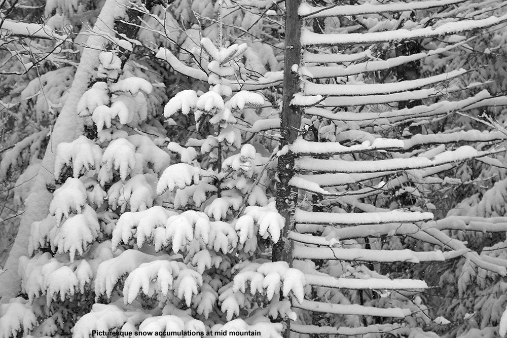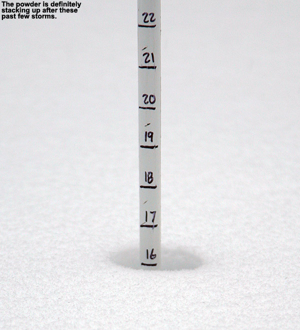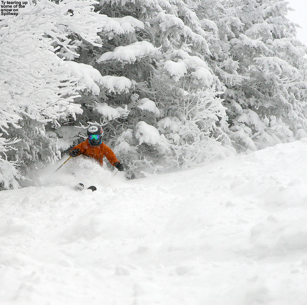 It was indeed nice to finally get to see part of Cup Runneth Over, but I wanted to keep exploring, so I merged onto Bryant and headed upward. I noticed what looked like some open trees in the forest below Possum, and did a quick tour through the area to see what it offered. The terrain there really needs no glading, as the natural make-up of the forest would lend itself to plenty of turns. The pitch is such that it would be great after one of those events that deliver 4 to 6 inches of light powder over a smooth, firm base. Much more than that amount of snow though, and the pitch is just not there – even today it would have been slow with the 7 or 8 inches of medium weight snow atop the snowpack, but that was also in part due to the snow being slow because of the cold temperatures. Continuing upward on Bryant, I saw tracks on fairly steep lines like A1A, JJ’s, and Big Blue, and the coverage certainly looked sufficient. I eventually got into the areas of protected evergreens that really hold the snow, and you could see that they were choked with powder. Up at the Bryant Cabin at ~2,700’ I found the powder to be in the 8 to 9-inch range.