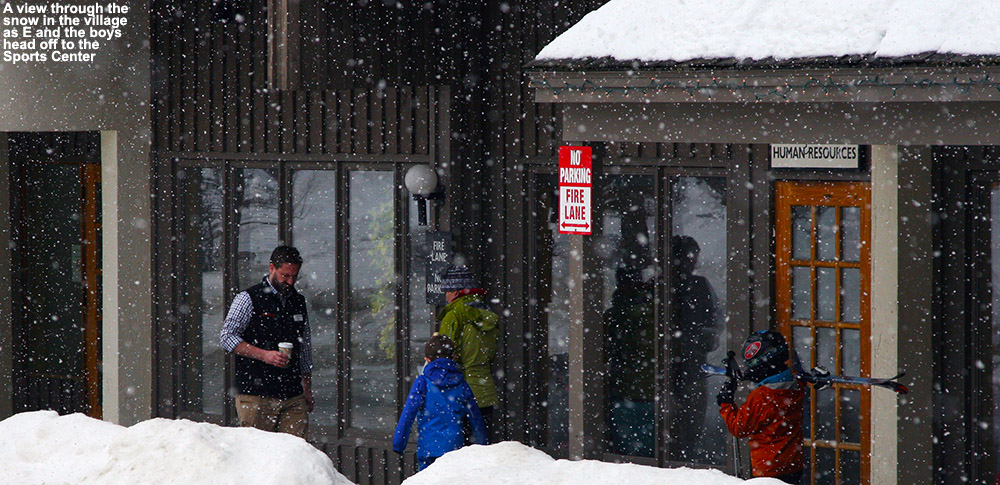 Although we still had daylight, the night skiing lights continued to come on as the resort shifted into night skiing mode. It was 4:15 PM, and I had to be in Burlington for dinner, but we decided to catch a final run off the Mid Mountain Chair – Ty really wanted another chance to ski his line behind the racing fence on Beech Seal. The snow continued to pour down, now with some larger flakes more reminiscent of upslope, and as we skied along I commented to E on how conditions were almost of the type we like for night skiing – fresh snow, no wind, and relatively warm. For those that went out last night to the slopes, I’d say they chose a good one. Ty got to ski his line, and Dylan followed along as well, continuing on to the second fence where the line ends in a bunch of brush. Dylan extricated himself easily though, and came out smiling.