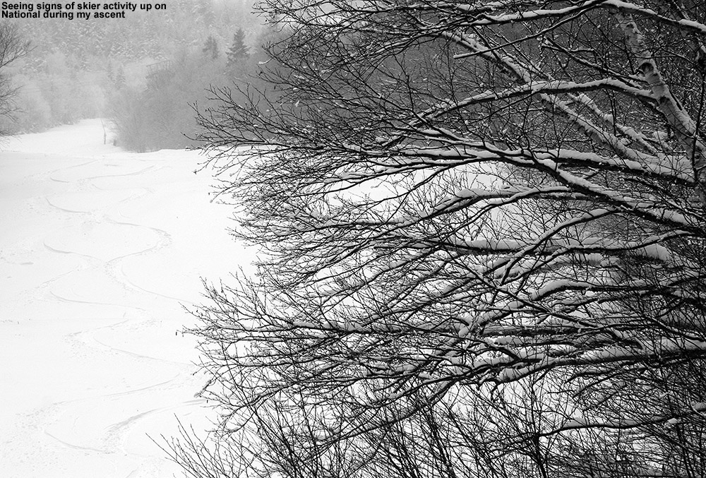 Heading next to the Vista Quad, we took Spillway, finding some good turns, but again a notch below what we’d found on Monday. Ty worked the terrain with fresh snow off to the skier’s right, but wasn’t interested in setting up any photos; clearly the snow couldn’t quite inspire him the way the last storm did. E wasn’t feeling comfortable enough on her Teles today to stick tight to the soft snow on the edge of Spillway, so spending more time toward the middle of the trail, she had to deal with some icy, high-traffic spots. As we descended toward Mid Mountain, the boys toured us through some nooks and crannies of access roads in order to ski under a big bent over tree. That was a bit of a slow route, but you could get a feel for just how much snow was starting to build on the natural terrain. We checked out Beech Seal on the lower mountain – I hit the usual soft snow on the skier’s right and found it performing right in line with the other terrain we’d skied. The skiing was great, just a notch below the last storm. I hadn’t seen where Ty had gone on Beech Seal, but it turns out he’d snuck over into the little lane of terrain on the right beyond the racing fence. He gets a kick out of being over there, and of course he’s probably one of the only people who can comfortably fit in there and loves the fact that the powder is untouched.