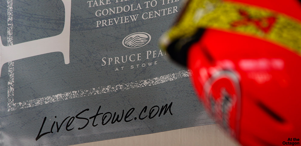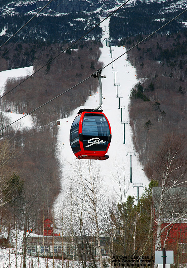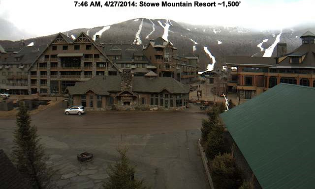 The lower mountain valleys around here in Northern Vermont have fairly patchy snow coverage now, and you have to get up into that 1,000′ to 1,500′ foot elevation range for really solid snow cover. But once you get up into those elevations, the coverage is great; there’s about a foot and a half of natural snow down at Stowe’s base elevations, and the depth simply explodes upward the higher you go. Up around 3,700′ at the Mt. Mansfield Stake, the snowpack is in the six to seven foot range. You can tell that coverage is great if you pan around at Stowe’s base area – even south-facing Spruce Peak is doing well. The morning snow report indicated that the Alpine Double would be running over at Spruce, but with the other lifts there closed down for the season, and the Gondola not running either, the Mansfield Base Lodge was really the most practice place to base yourself.
