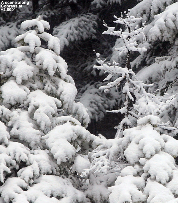 Temperatures were in the upper 30s F down in the Winooski Valley with light rain/mist, and as I headed westward through Bolton Flats, the intensity of the precipitation picked up. The rain changed over to snow at ~1,200’ on the Bolton Valley Access Road, and first signs of new snow accumulation were at the Timberline Base at 1,500’. I suspect that accumulations had reached lower based on that image that PF showed earlier from 800’ in Nashville, but it seemed like the snow line had already risen a bit by the time I was up there. As I continued to ascend the road beyond the Timberline Base, the deciduous trees took on a picturesque coating of white, and gradually the ground began to fill in with white as well.