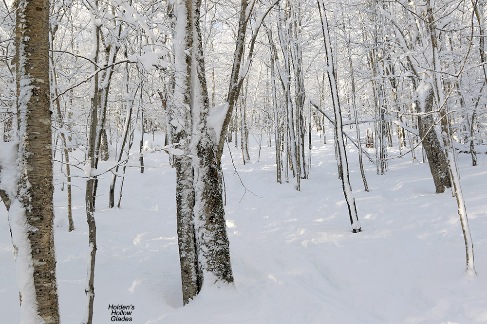 I told the students that we’d be heading out past Angel Food on the traverse, and that we’d play it by ear as we scoped out the terrain. The traverse was in great shape, and the powder up there was midwinter light aside from areas exposed to significant sun. In those areas you could see that powder was just starting to take on some melt, so we knew that we might want to factor that into our skiing if we had options. Once past Angel Food, we continued on the traverse for a few more minutes and headed upward with some side stepping. I didn’t recall ever seeing any specific trail signs in the area, but I told the kids to keep their eyes peeled for anything they might see in that regard. I didn’t see any obvious trail signs, but I did see an interesting piece of artwork on a paper birch just above the traverse that presumably had some interesting meaning – it was a pair of eyes with almost mask-like surroundings. Not long after passing that image, I felt like we’d gone far enough and opted to take the next obvious line for the descent. I chose one with a couple of tracks, which in this case was good; we were doing a bit of exploring, but I didn’t want to take the kids on anything too exotic that might push things over the edge. Eventually as one gets farther and farther into the notch, things can get overly steep, and that’s not what we were looking for.