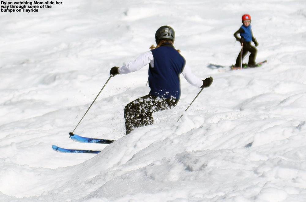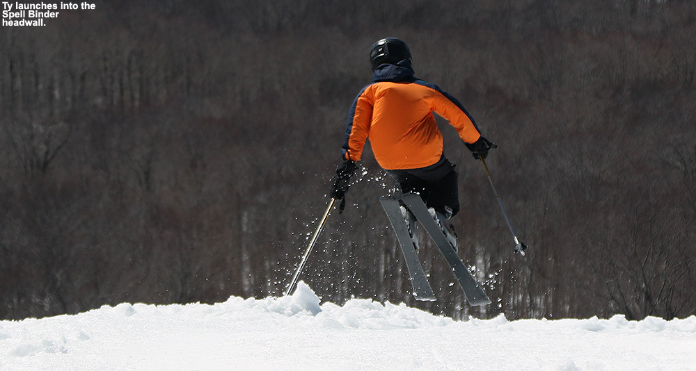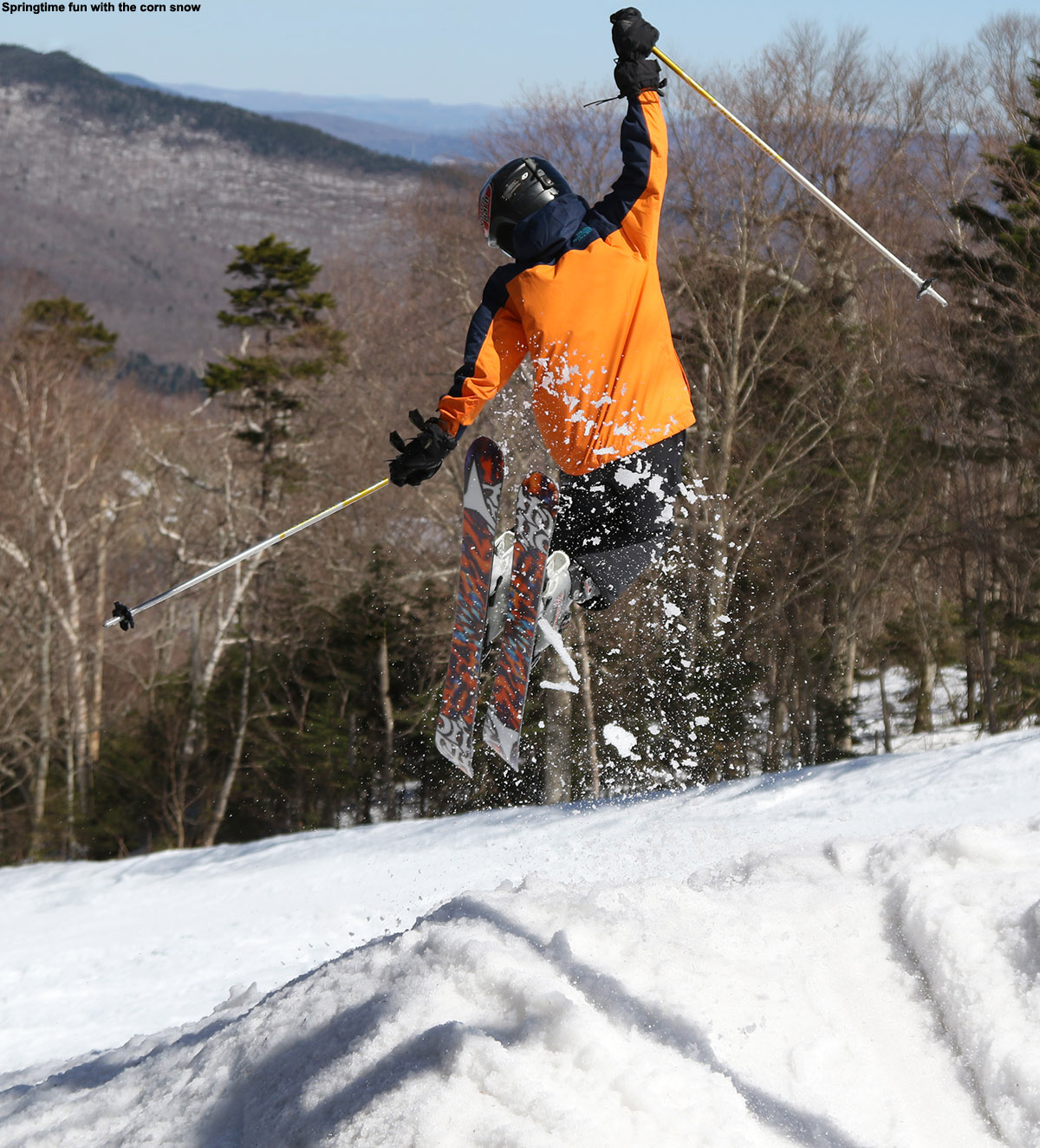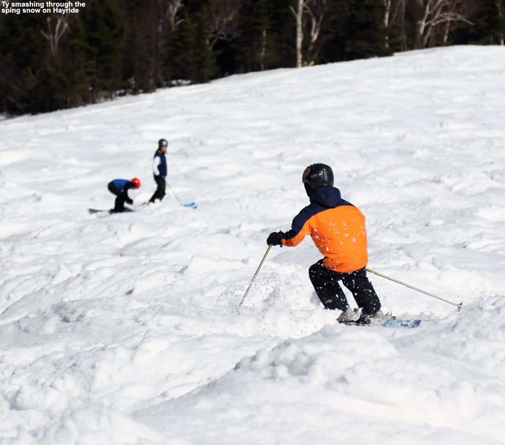 Overall, the skiing was a little sloppy in spots, but there’s generally been plenty of freeze-thaw cycles to get the snow turned into corn. We did find some snow high up in the bypass chutes that was almost wintry in consistency because it was so protected from warmth. Hayride was fun, with some steep bump lines, although they were generally spaced wider than our preference. Lower National had much better bump lines as is typical. We also had some fun cruising on Lord. As usual during the corn harvest season, we had our own corn harvest of sorts each run as everyone got the snow off their skis to supply snowballs for lift tower and chair target practice.