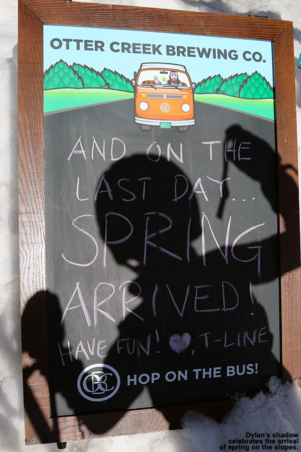Today was Stowe’s final lift-served day of the season, and with a pleasant, sunny forecast, we headed off for some runs in the afternoon. Temperatures were in the 50s F at the base, and the Mansfield parking lot was awash in group after group of tailgaters. We got a nice parking space in front of the Mansfield Base Lodge from someone who was just leaving and hoofed it up to the base of the Fourrunner Quad. There was a lift queue of a few minutes, which seems to be common this time of the year when the Fourrunner Quad is bearing the lion’s share of the workload.