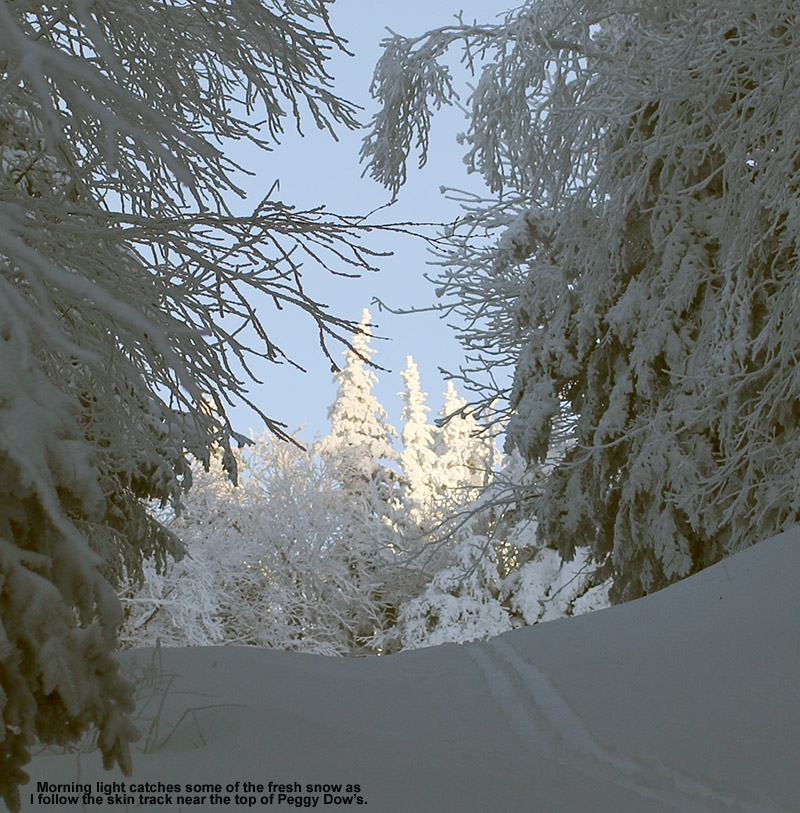 I got on my way and checked the depth of the powder at Village level. Bolton Valley had reported 18 inches from the storm in their higher elevations, and I found that settled powder depths today at ~2,000’ were 10-12 inches. I could see that coverage was excellent as I skinned my way up the Bryant Trail; there really aren’t any concerns about bare spots on the main routes at this point. Up at the cabin at ~2,700 I found that the depth of the powder had bumped up a couple of inches to the 12-14” range. It was a gorgeous time to be out on the trails in that last hour before sunset, and I saw a few other Nordic and backcountry skiers out there enjoying the scene as well.