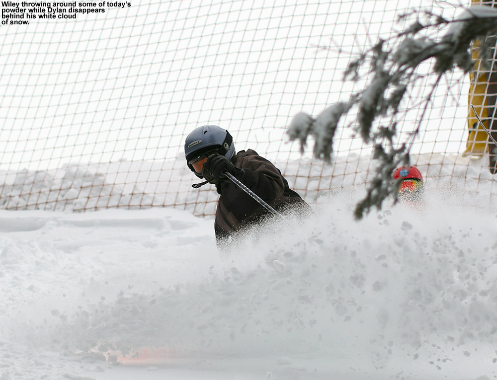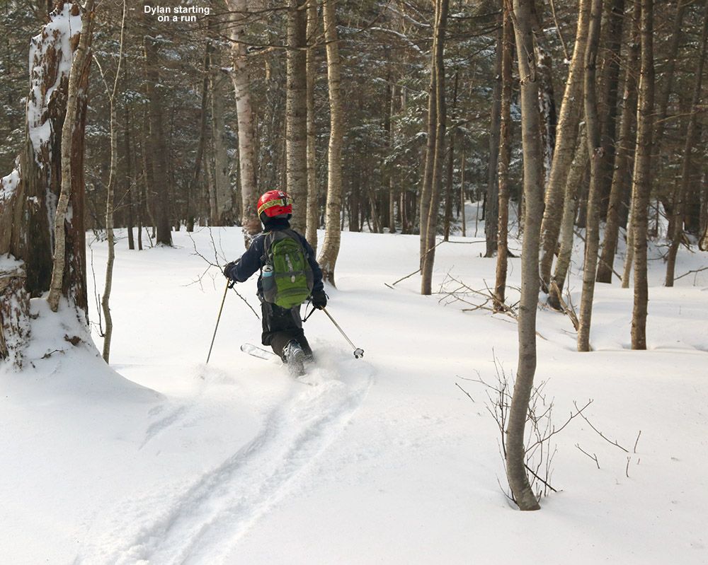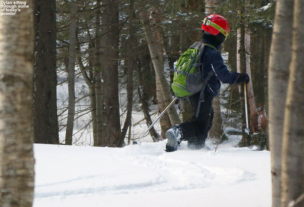 Unfortunately for Ken, he really brought the wrong pair of skis today. He was at Sugarbush yesterday where he found bulletproof conditions and struggled on skis with no edges. Anticipating the same thing today, he brought his freshly-sharpened, skinny, 195 cm old-school cruising skis. He couldn’t believe that we were skiing almost a foot of powder up high, and his long, skinny skis were essentially the exact opposite of what he would have liked to have in tight, powder-filled trees. We joked about how we used to ski everything on such skis, no matter how tight, but the new shorter, fatter, rockered, twin-tipped boards are so superior, and one can forget how much work it takes to push around those long sticks.