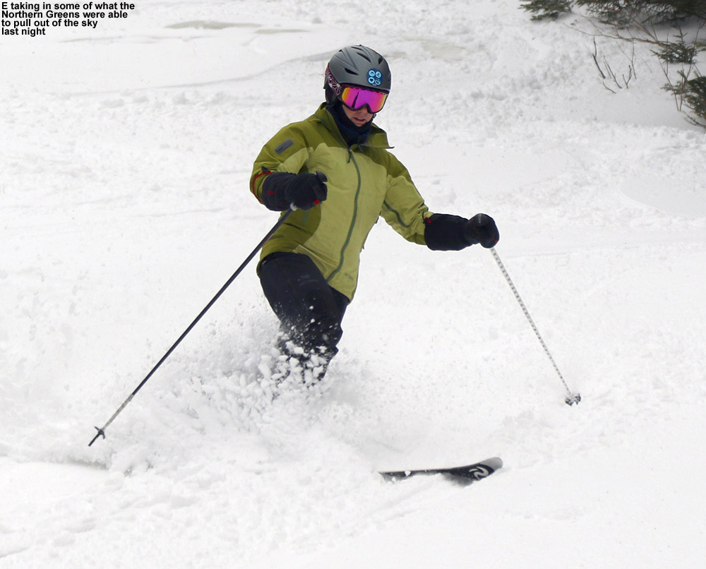 We finished off the day over at Spruce Peak, where areas in the sun were already turning to spring corn snow. The resort had made some huge snow whales on West Slope, and everyone was lapping those, which held soft snow and some great contours and drops. It’s definitely starting to feel like spring with the lasting sunlight we’ve got, but apparently we’ve still got some winter storm to come – the forecast suggests we’ve got three potential storms this week, so it should be interesting to see where things stand next weekend. Right now the Mt. Mansfield Stake is at 34”, so if things break right perhaps we’ll hit that magic 40” mark that means that most of the off piste terrain is reasonably well covered.