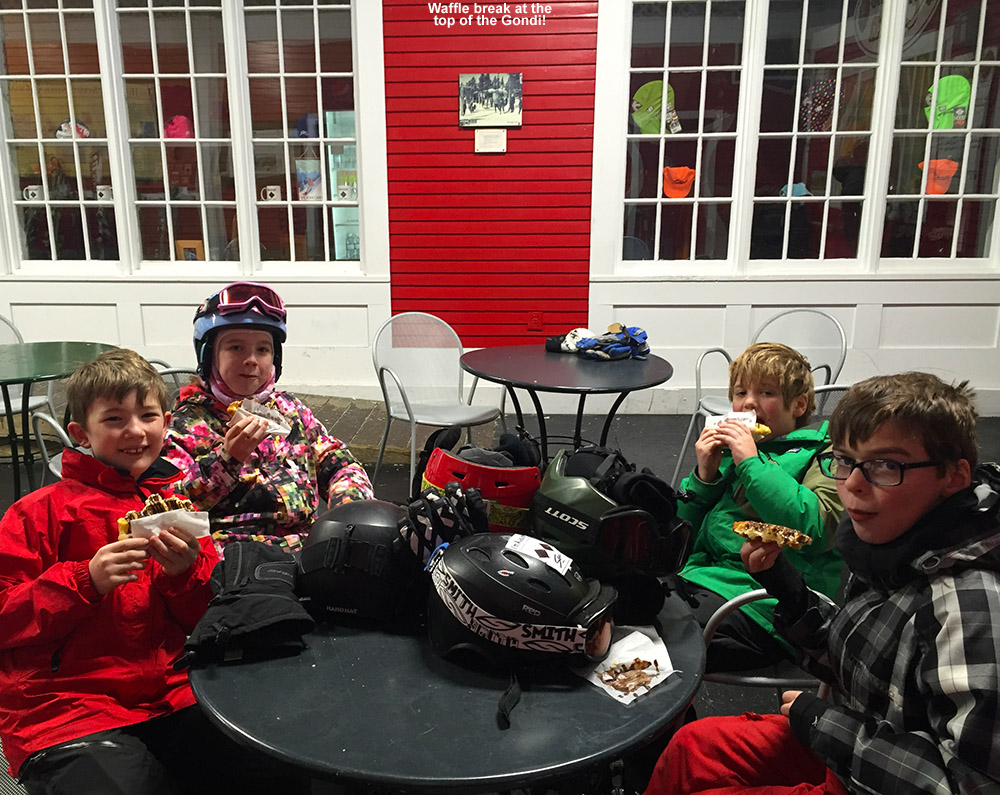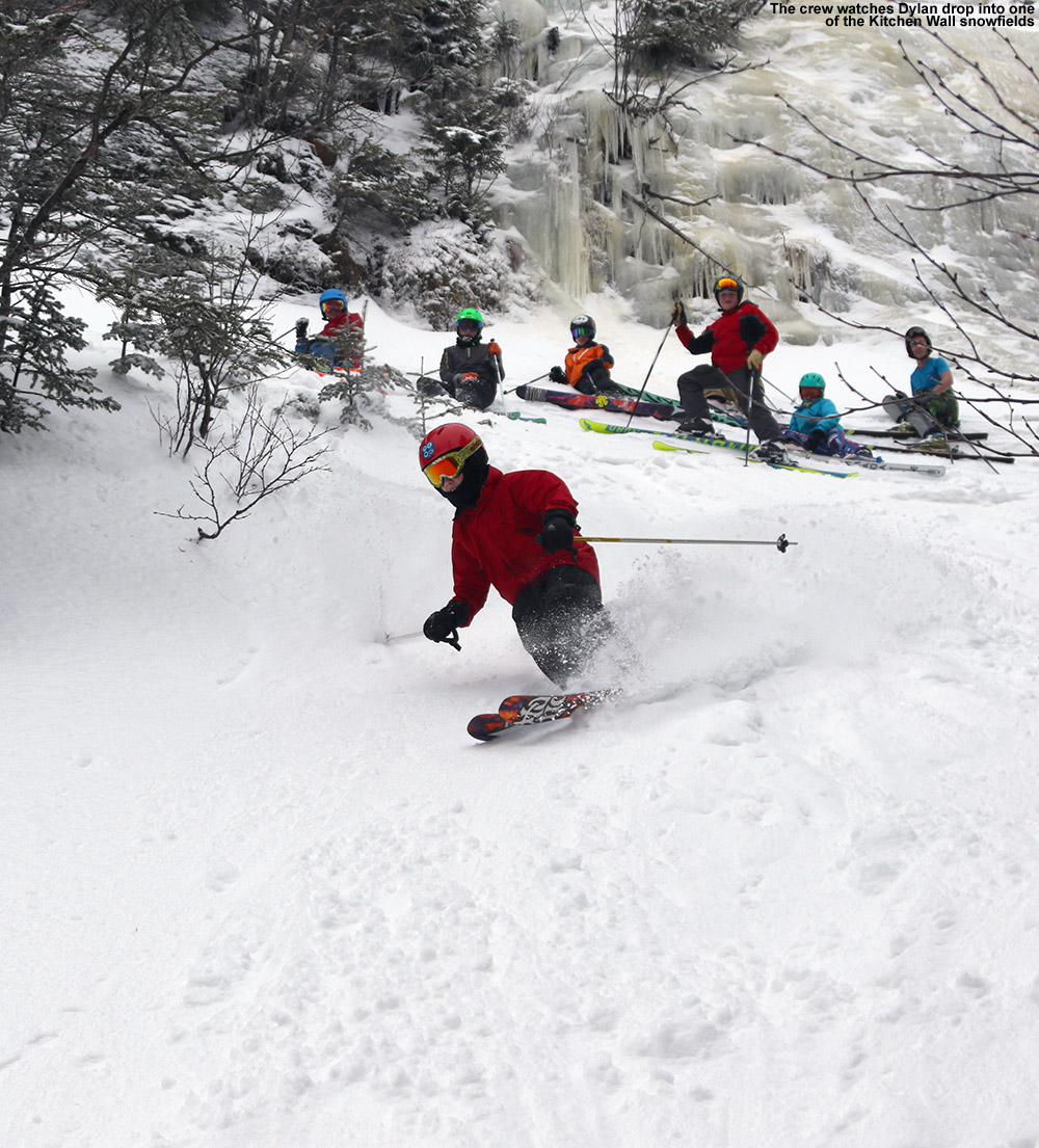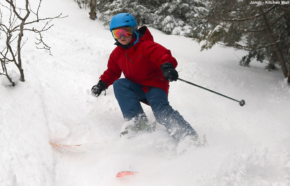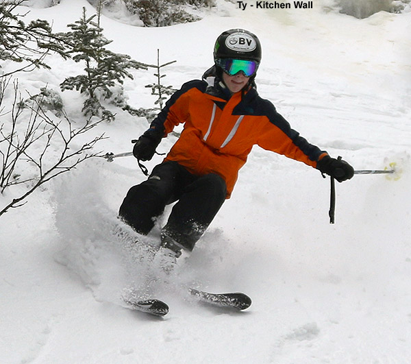 Ken and I had a fairly large group with 7 students today, and based on the way the snow had played out yesterday at Bolton, we immediately took everyone to the top of the Gondola and into the lower reaches of the Kitchen Wall terrain to get a feel for how the powder was skiing. The snow was excellent, with a good 6 to 8 inches of midwinter powder for everyone to enjoy. The students commented on numerous occasions how good the snow was. The best powder lasted down to about the 3,000’ mark before it began to get thinner and a bit wetter. At that point we’d stick to the trails, where conditions varied from midwinter snow to spring like, to ice, depending on elevation and aspect.