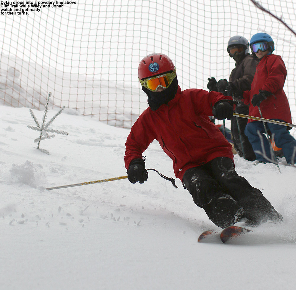 The kids had liked the first run so much that on our next one we took the high Kitchen Wall traverse and dropped into the untracked powder in one of the snowfields. There was a good 8-12” of snow up there, so bottomless turns were the norm. Even down below in the evergreens we found plenty of untracked lines and the kids’ overall energy was very positive. One line that we found ended up taking us basically through a cave, and you had to do some major body contortions to pull that line off smoothly.