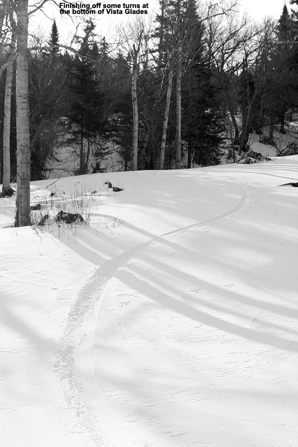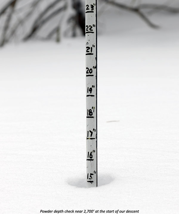 We took a trip down Nosedive and found coverage to be in great shape – there should be plenty of earned turns there well into May as usual. I’d say the same is generally true for the typical Lord/North Slope route as well. On our last run, the boys ski technique really degraded… on purpose as it turned out. They had loads of fun goofing around with poor technique and were incredibly impressed with how much more work it took to ski that way – especially in areas of soft snow.