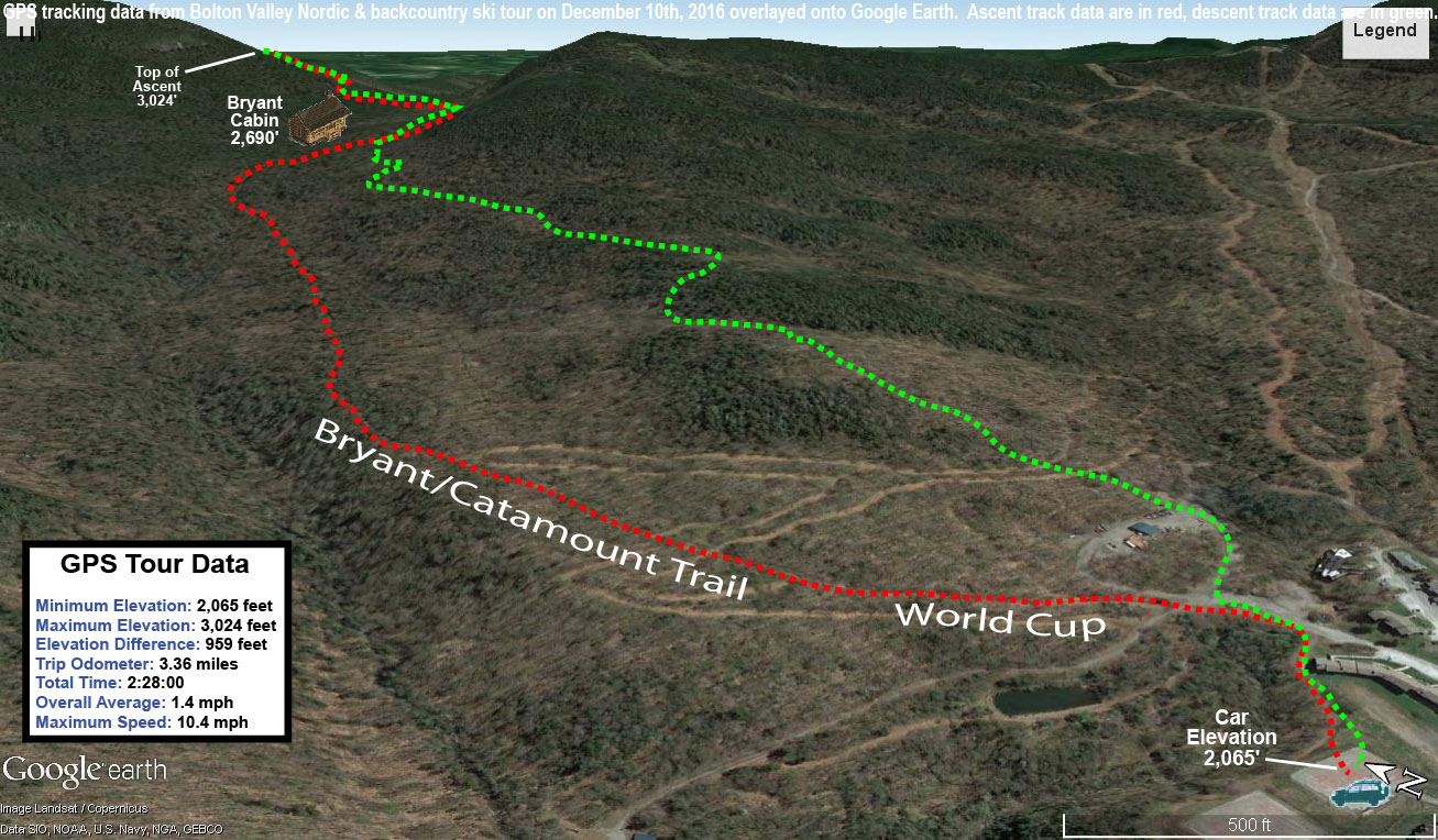 GPS/Google Earth plot of today’s backcountry ski tour at Bolton Valley